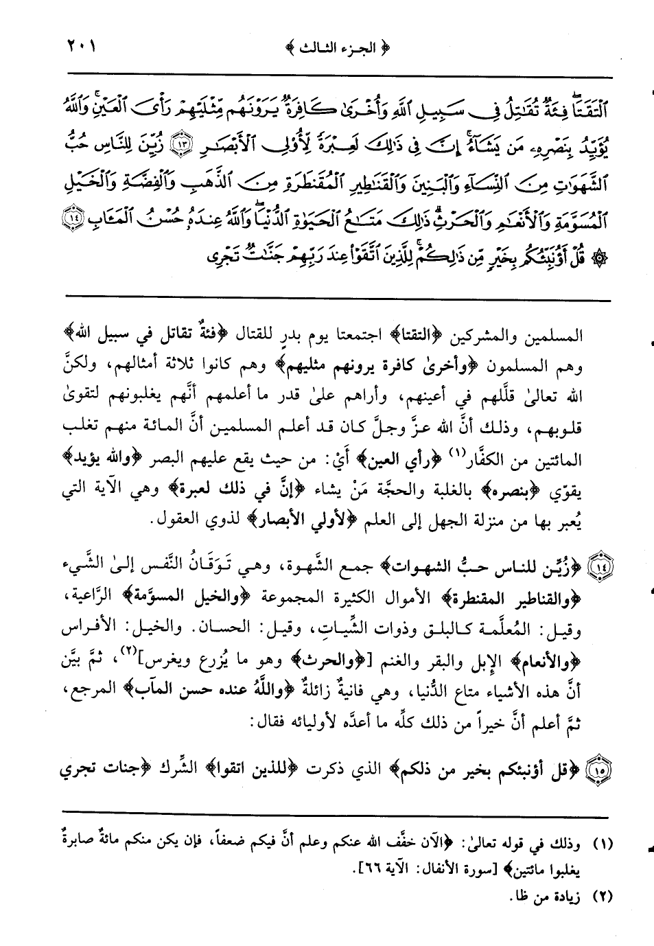 {زُيِّن للناس حبُّ الشهوات} جمع الشَّهوة وهي تَوَقَانُ النَّفس إلى الشَّيء {والقناطير المقنطرة} الأموال الكثيرة المجموعة {والخيل المسوَّمة} الرَّاعية وقيل: المُعلَّمة كالبلق وذوات الشِّياتِ وقيل: الحسان والخيل: الأفراس {والأنعام} الإِبل والبقر والغنم {والحرث} وهو ما يُزرع ويغرس ثمَّ بيَّن أنَّ هذه الأشياء متاع الدُّنيا وهي فانيةٌ زائلةٌ {واللَّهُ عنده حسن المآب} المرجع ثمَّ أعلم أنَّ خيراً من ذلك كلِّه ما أعده لأوليائه فقال