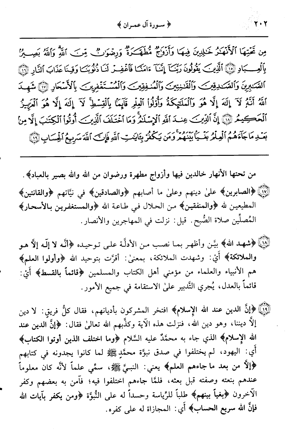 {إنَّ الدين عند الله الإِسلام} افتخر المشركون بأديانهم فقال كلُّ فريقٍ: لا دين إلاَّ ديننا وهو دين الله فنزلت هذه الآية وكذَّبهم الله تعالى فقال: {إنَّ الدين عند الله الإِسلام} الذي جاء به محمد عليه السلام {وما اختلف الذين أوتوا الكتاب} أَي: اليهود لم يختلفوا في صدق نبوَّة محمد صَلَّى اللَّهُ عَلَيْهِ وسلم لما كانوا يجدونه في كتابهم {إِلا مِنْ بَعْدِ مَا جَاءَهُمُ الْعِلْمُ} يعني: النبي صلى الله عليه وسلم سمِّي علماً لأنَّه كان معلوماً عندهم بنعته وصفته قبل بعثه فلمَّا جاءهم اختلفوا فيه فآمن به بعضهم وكفر الآخرون {بغياً بينهم} طلباً للرِّياسة وحسداً له على النُّبوَّة {وَمَنْ يَكْفُرْ بِآيَاتِ اللَّهِ فَإِنَّ اللَّهَ سَرِيعُ الحساب} أَي: المجازاة له على كفره