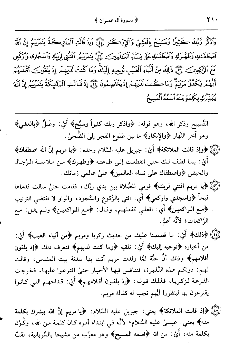 {إذ قالت الملائكة} يعني: جبريل عليه السَّلام: {يَا مَرْيَمُ إِنَّ اللَّهَ يُبَشِّرُكِ بِكَلِمَةٍ مِنْهُ} يعني: عيسى عليه السَّلام لأنَّه في ابتداء أمره كان كلمة من الله وكُوِّن بكلمة منه أَيْ: من الله {اسمه المسيح} وهو معرَّب من مشيحا بالسِّريانية لقبٌ لعيسى ثمَّ فَسَّر وبيَّن من هو فقال: {عيسى ابن مريم وجيهاً} أَيْ: ذا جاهٍ وشرفٍ وقدرٍ {في الدنيا والآخرة ومن المقربين} إلى ثواب الله وكرامته