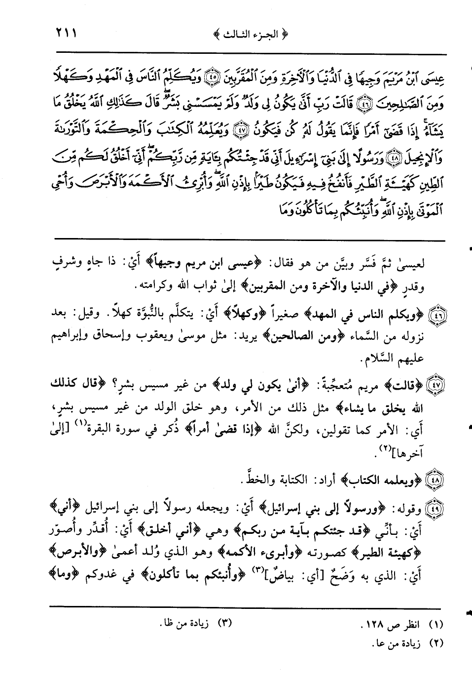 {ويكلم الناس في المهد} صغيراً {وكهلاً} أَيْ: يتكلَّم بالنُّبوَّة كهلاً وقيل: بعد نزوله من السَّماء {ومن الصالحين} يريد: مثل موسى ويعقوب وإسحاق وإبراهيم عليهم السِّلام