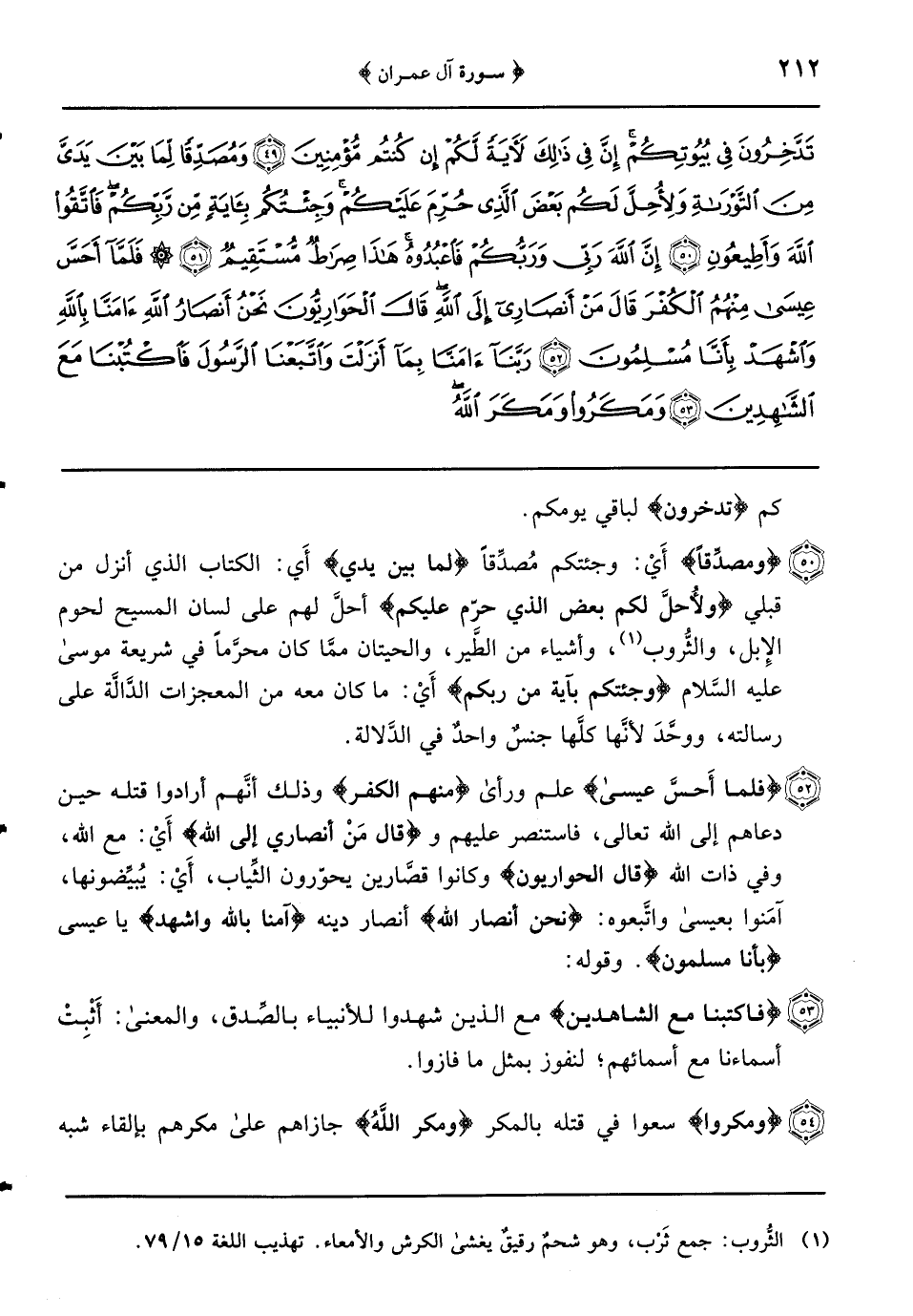 {ومصدِّقاً} أَيْ: وجئتكم مُصدِّقاً {لِمَا بَيْنَ يَدَيَّ} أَي: الكتاب الذي أنزل من قبلي {ولأُحلَّ لكم بعض الذي حرّم عليكم} أحلَّ لهم على لسان المسيح لحوم الإِبل والثُّروب وأشياء من الطَّير والحيتان ممَّا كان محرَّماً في شريعة موسى عليه السَّلام {وجئتكم بآية من ربكم} أَيْ: ما كان معه من المعجزات الدَّالَّة على رسالته ووحَّدَ لأنَّها كلَّها جنسٌ واحد في الدلالة