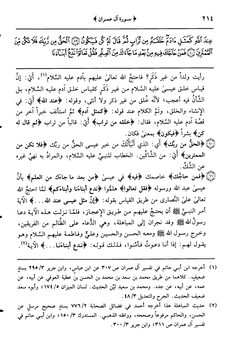 {فمن حاجَّك} خاصمك {فيه} في عيسى {من بعد ما جاءك من العلم} بأنَّ عيسى عبد الله ورسوله {فقل تعالوا} هلمُّوا {ندع أبناءَنا وأبناءَكم} لمَّا احتجَّ الله تعالى على النَّصارى من طريق القياس بقوله: {إنّ مثل عيسى عند الله} الآية أمر النبي صلى الله عليه وسلم أن يحتجَّ عليهم من طريق الإِعجاز فلمَّا نزلت هذه الآية دعا رسولُ الله صلى الله عليه وسلم وفد نجران إلى المباهلة وهي الدُّعاء على الظَّالم من الفريقين وخرج رسول الله صلى الله عليه وسلم ومعه الحسن والحسين وعليٌّ وفاطمة عليهم السَّلام وهو يقول لهم: إذا أنا دعوتُ فأمِّنوا فذلك قوله: {ندع أبناءَنا} الآية وقوله: {وأنفسنا وأنفسكم} يعني: بني العمِّ {ثمَّ نبتهل} نتضرع في الدُّعاء وقيل: ندعو بالبهلة وهي اللعنة فندعو الله باللَّعنةِ على الكاذبين فلم تُجبه النَّصارى إلى المباهلة خوفاً من اللَّعنه وقَبِلوا الجزية