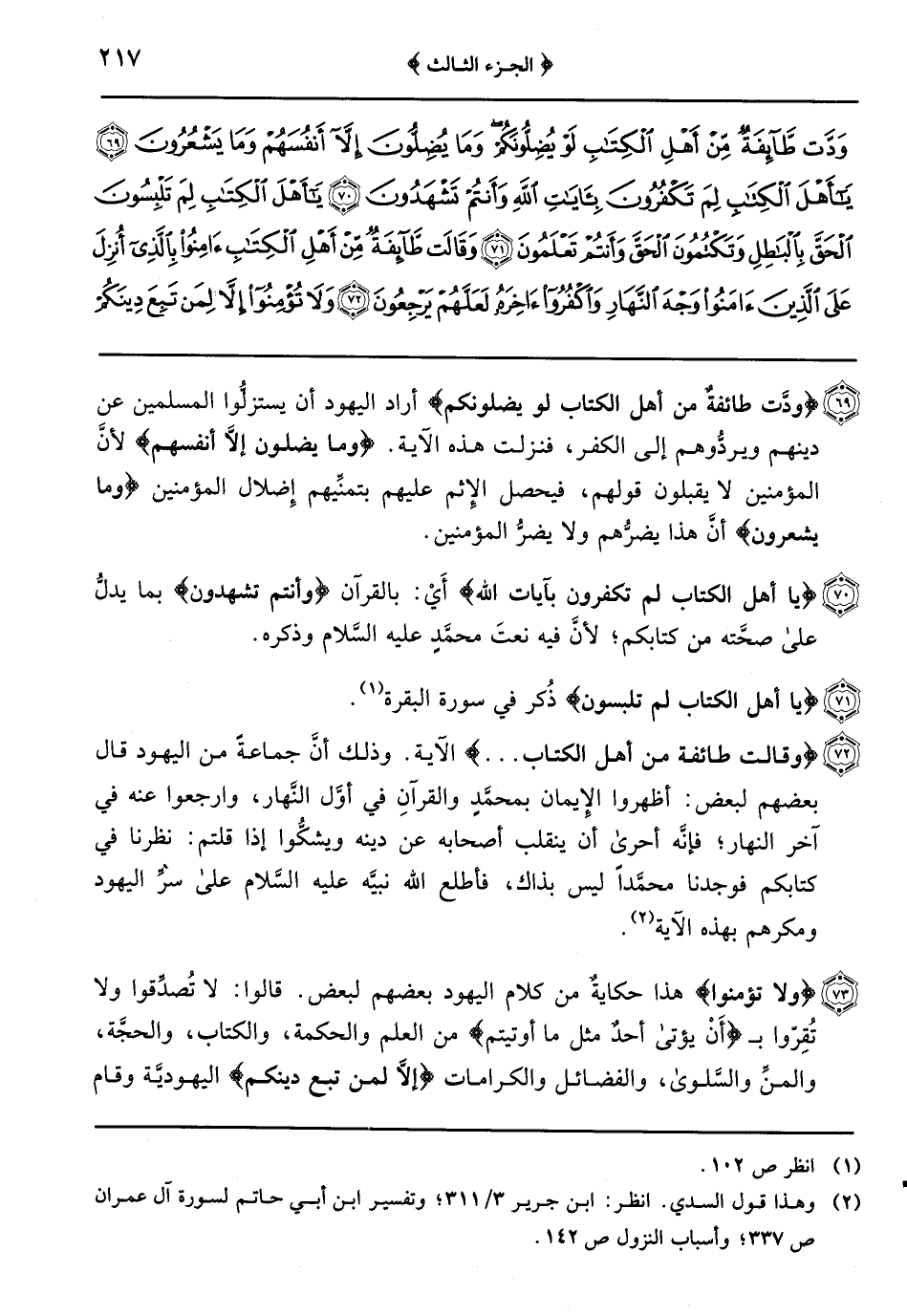 {ولا تؤمنوا} هذا حكايةٌ من كلام اليهود بعضهم لبعض قالوا: لا تُصدِّقوا ولا تُقِرّوا ب {أَنْ يُؤْتَى أَحَدٌ مِثْلَ مَا أُوتِيتُمْ} من العلم والحكمة والكتاب والحجَّة والمنِّ والسَّلوى والفضائل والكرامات {إلاَّ لمن تبع دينكم} اليهوديَّة وقام بشرائعه وقوله: {قل إنَّ الهدى هدى الله} اعتراضٌ بين المفعول وفعله وهو من كلام الله تعالى وليس من كلام اليهود ومعناه: إنَّ الدِّين دين الله وقوله: {أو يحاجُّوكم} عطف على قوله: {أَنْ يُؤْتَى} والمعنى: ولا تؤمنوا بأن يحاجُّوكم عند ربكم لأنَّكم أصحُّ ديناً منهم فلا يكون لهم الحجَّة عليكم فقال الله تعالى: {قل إنَّ الفضل بيد الله} أَيْ: ما تفضَّل الله به عليك وعلى أُمتِّك