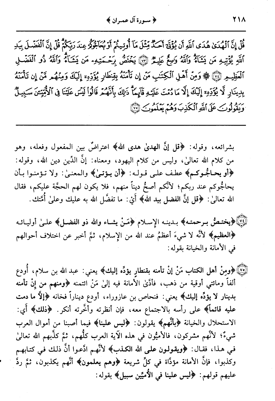 {وَمِنْ أَهْلِ الْكِتَابِ مَنْ إِنْ تَأْمَنْهُ بقنطارٍ يؤدِّه إليك} يعني: عبد الله بن سلام أُودع ألفاً ومائتي أوقية من ذهب فأدَّى الأمانة فيه إلى مَنْ ائتمنه {وَمِنْهُمْ مَنْ إِنْ تَأْمَنْهُ بِدِينَارٍ لا يُؤَدِّهِ إليك} يعني: فنحاص بن عازوراء أودع ديناراً فخانه {إلاَّ ما دمت عليه قائماً} على رأسه بالاجتماع معه فإن أنظرته وأخَّرته أنكر {ذلك} أَيْ: الاستحلال والخيانة {بأنَّهم} يقولون: {ليس علينا} فيما أصبنا من أموال العرب شيءٌ لأنَّهم مشركون فالأميُّون في هذه الآية العرب كلُّهم ثم كذبهم الله تعالى في هذا فقال {ويقولون على الله الكذب} لأنَّهم ادَّعوا أنَّ ذلك في كتابهم وكذبوا فإنَّ الأمانة مؤدَّاة في كلِّ شريعة {وهم يعلمون} أَنَّهم يكذبون ثمَّ ردَّ عليهم قولهم: {ليس علينا في الأُمييِّن سبيل} بقوله: