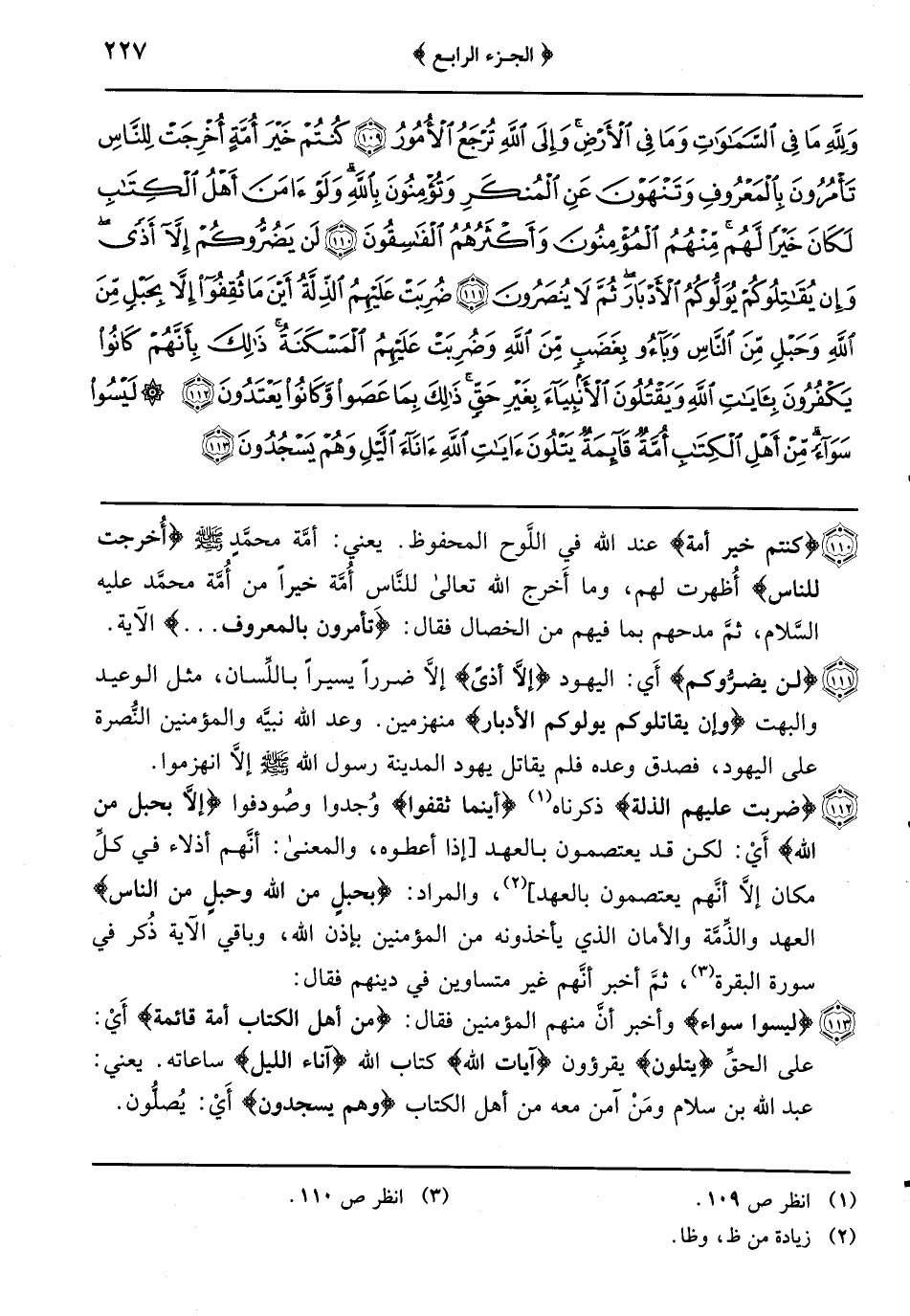 {ضربت عليهم الذلة} ذكرناه {أينما ثقفوا} وُجدوا وصُودفوا {إلاَّ بحبل من الله} أَيْ: لكن قد يعتصمون بالعهد (إذا أعطوه والمعنى: أنَّهم إذلاء في كلِّ مكان إلاَّ أنَّهم يعتصمون بالعهد) والمراد {بحبلٍ من الله وحبلٍ من الناس} العهد والذِّمَّة والأمان الذي يأخذونه من المؤمنين بإذن الله وباقي الآية ذُكر في سورة البقرة ثمَّ أخبر أنَّهم غير متساوين في دينهم فقال: