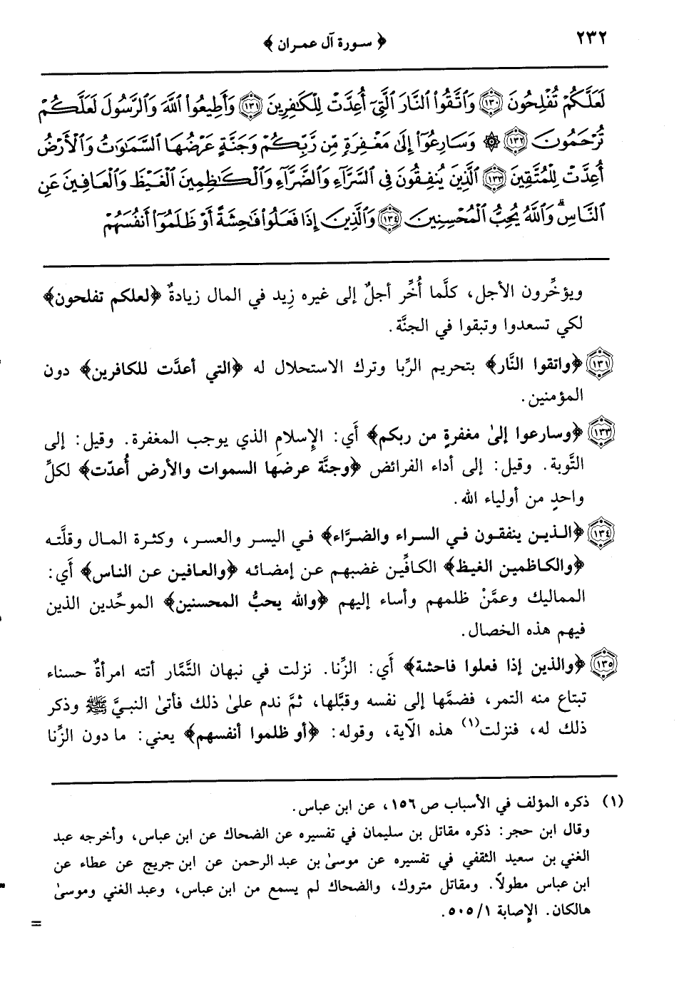 {والذين إذا فعلوا فاحشة} أَي: الزِّنا نزلت في نبهان التَّمَّار أتته امراةٌ حسناء تبتاع منه التمر فضمَّها إلى نفسه وقبَّلها ثمَّ ندم على ذلك فأتى النبي صلى الله عليه وسلم وذكر ذلك له فنزلت هذه الآية وقوله: {أو ظلموا أنفسهم} يعني: ما دون الزِّنا من قُبلةٍ أو لمسةٍ أو نظرٍ {ذكروا الله} أيْ: ذكروا عقاب الله {ولم يُصرُّوا} أَيْ: لم يقيموا ولم يدوموا {على ما فعلوا} بل أقرُّوا واستغفروا {وهم يعلمون} أن الذي أتوه حرام ومعصية