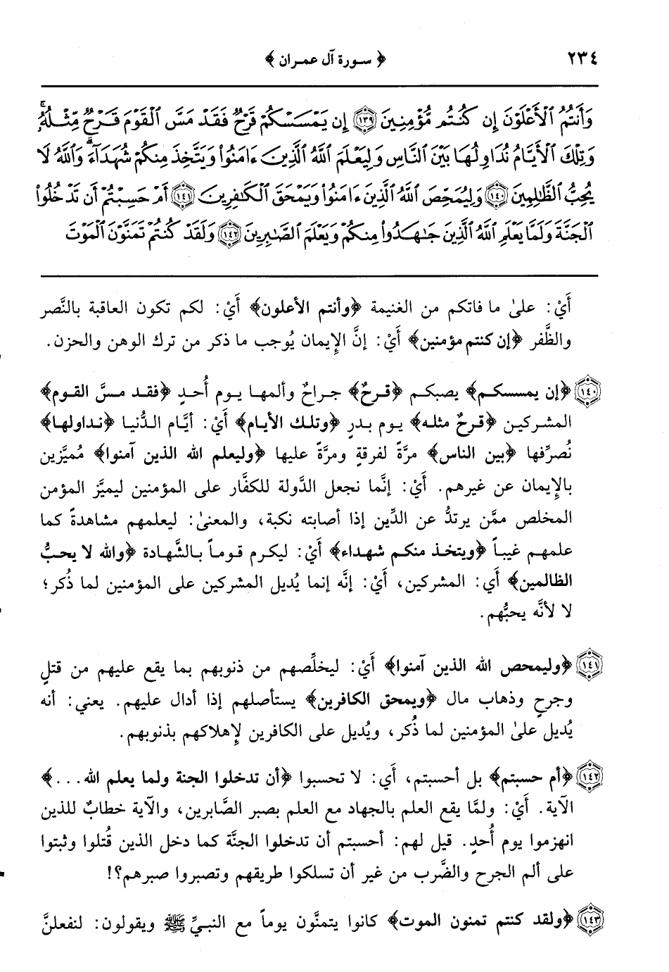 {إن يمسسكم} يصبكم {قرحٌ} جراحٌ وألمها يوم أُحدٍ {فقد مسَّ القوم} المشركين {قرحٌ مثله} يوم بدرٍ {وتلك الأيام} أَيْ: أيَّام الدُّنيا {نداولها} نُصرِّفها {بين الناس} مرَّةً لفرقةٍ ومرَّةً عليها {وليعلم الله الذين آمنوا} مُميَّزين بالإٍيمان عن غيرهم أَيْ: إِنَّما نجعل الدَّولة للكفَّار على المؤمنين ليميَّز المؤمن المخلص ممَّن يرتدُّ عن الدِّين إذا أصابته نكبة والمعنى: ليعلمهم مشاهدةً كما علمهم غيباً {ويتخذ منكم شهداء} أَيْ: ليكرم قوماً بالشَّهادة {والله لا يحبُّ الظالمين} أَي: المشركين أَيْ: إنَّه إنما يُديل المشركين على المؤمنين لما ذُكر لا لأنَّه يحبُّهم