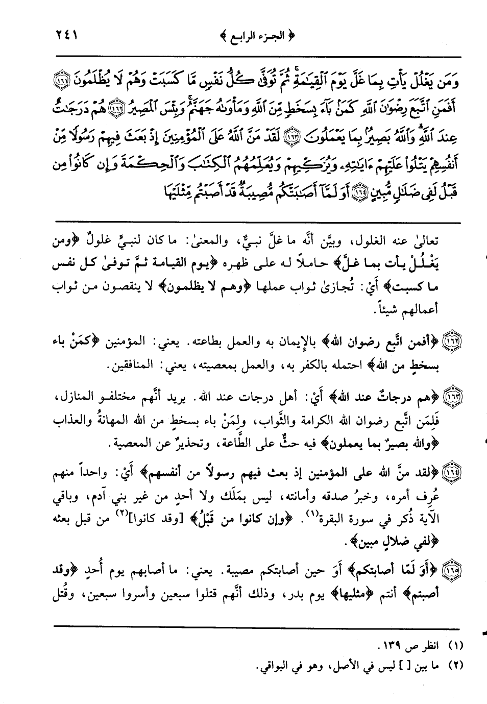 {هم درجاتٌ عند الله} أَيْ: أهل درجات عند الله يريد أنَّهم مختلفو المنازل فَلِمَن اتِّبع رضوان الله الكرامة والثَّواب ولِمَنْ باء بسخطٍ من الله المهانةُ والعذاب {والله بصيرٌ بما يعملون} فيه حثٌّ على الطَّاعة وتحذيرٌ عن المعصية