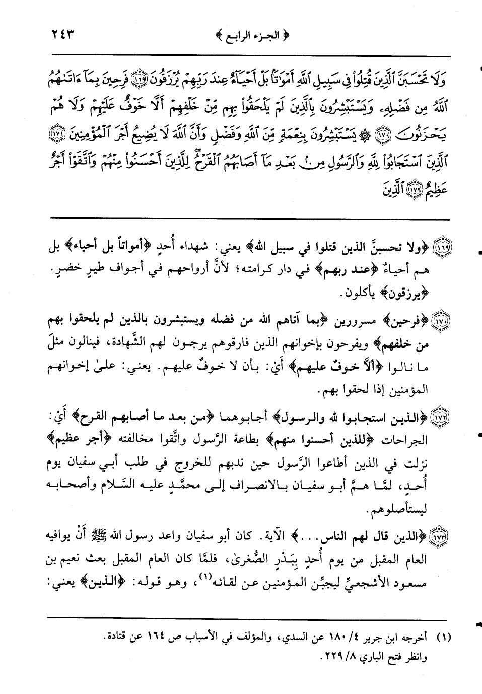 {وَلا تَحْسَبَنَّ الَّذِينَ قُتِلُوا فِي سَبِيلِ اللَّهِ} يعني: شهداء أُحدٍ {أمواتاً بل أحياء} بل هم أحياءٌ {عند ربهم} في دار كرامته لأنَّ أرواحهم في أجواف طيرٍ خضرٍ {يرزقون} يأكلون