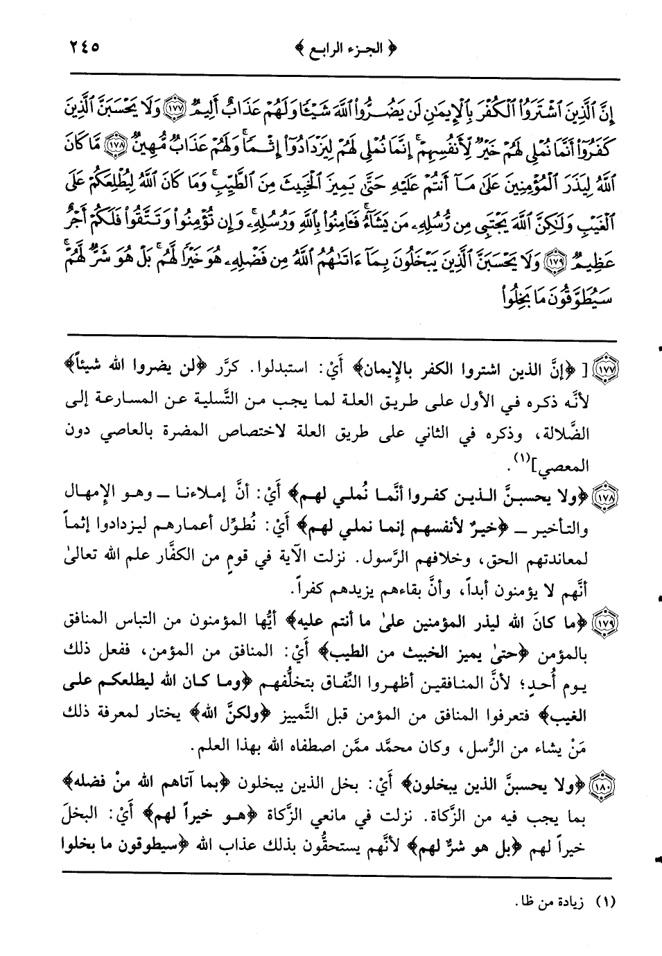 {ولا يحسبنَّ الذين يبخلون} أَيْ: بخل الَّذِينَ يَبْخَلُونَ {بِمَا آتَاهُمُ اللَّهُ مِنْ فَضْلِهِ} بما يجب فيه من الزَّكاة نزلت في مانعي الزَّكاة {هو خيراً لهم} أَيْ: البخلَ خيراً لهم {بل هو شرٌّ لهم} لأَنَّهم يستحقُّون بذلك عذاب الله {سَيُطَوَّقُونَ مَا بَخِلُوا بِهِ يَوْمَ القيامة} وهو أنَّه يُجعل ما بَخِل به من المال حيَّةً يُطوَّقها في عنقه تنهشه من قرنه إلى قدمه {ولله ميراث السماوات والأرض} أَيْ: إنَّه يُغني أهلهما وتبقى الأملاك والأموال لله ولا مالك لها إلاَّ الله تعالى