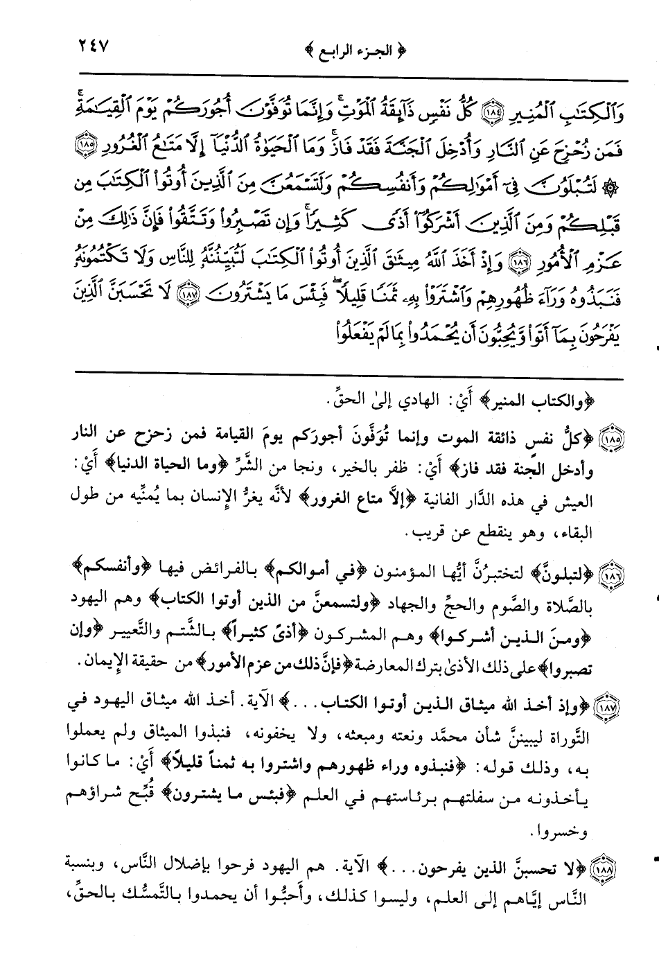 {لتبلونَّ} لتختبرُنَّ أيُّها المؤمنون {في أموالكم} بالفرائض فيها {وأنفسكم} بالصَّلاة والصَّوم والحجِّ والجهاد {ولتسمعنَّ من الذين أوتوا الكتاب} وهم اليهود {ومنَ الذين أشركوا} وهم المشركون {أذىً كثيراً} بالشَّتم والتَّعيير {وإن تصبروا} على ذلك الأذى بترك المعارضة {فَإِنَّ ذَلِكَ مِنْ عَزْمِ الأُمُورِ} من حقيقة الإِيمان