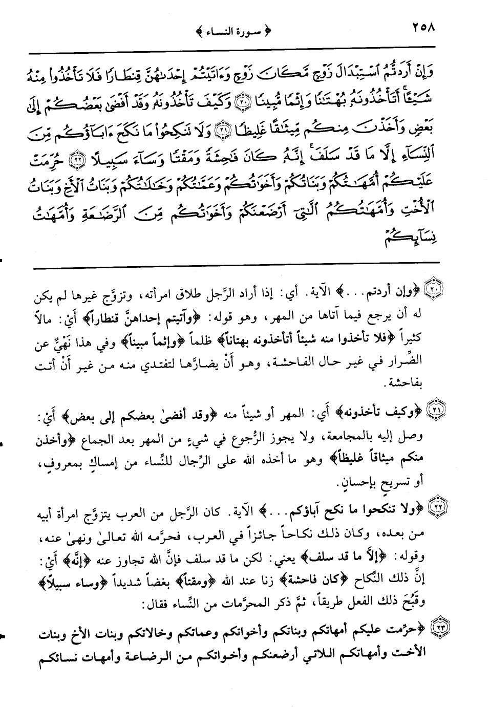 {حُرِّمَتْ عَلَيْكُمْ أُمَّهَاتُكُمْ وَبَنَاتُكُمْ وَأَخَوَاتُكُمْ وَعَمَّاتُكُمْ وَخَالاتُكُمْ وَبَنَاتُ الأَخِ وَبَنَاتُ الأُخْتِ وَأُمَّهَاتُكُمُ اللَّاتِي أَرْضَعْنَكُمْ وأخواتكم من الرضاعة وأمهات نسائكم وربائبكم} جمع الرَّبيبة وهِيَ بِنْت امرأة الرَّجُل من غيره {اللاتي في حجوركم} أيْ: في ضمانكم وتربيتكم {وحلائل} وأزواج {أبنائكم الذين من أصلابكم} لا مَنْ تبنَّيتموه {وأن تجمعوا} أَيْ: الجمع {بين الأختين إلاَّ ما قد سلف} مضى منكم في الجاهلية فلا تُؤاخذون به بعد الإِسلام