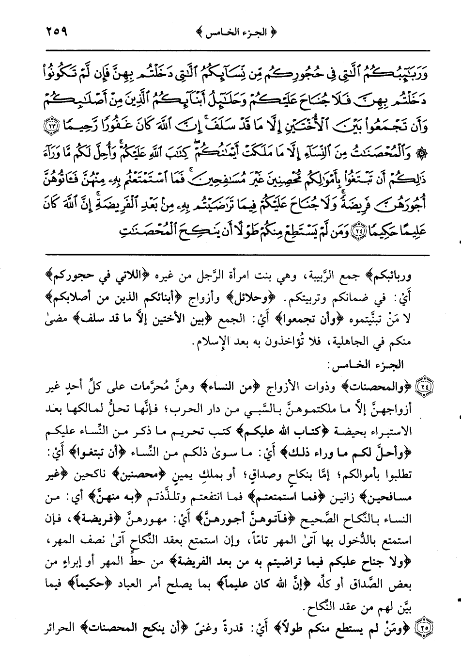 {والمحصنات} وذوات الأزواج {من النساء} وهنَّ مُحرَّمات على كلِّ أحدٍ غير أزواجهنَّ إِلَّا ما ملكتموهنَّ بالسَّبي من دار الحرب فإنَّها تحلُّ لمالكها بعد الاستبراء بحيضة {كتاب الله عليكم} كتب تحريم ما ذِكْرُ مَنْ النِّساء عليكم {وأحلَّ لكم ما وراء ذلك} أَيْ: ما سوى ذلكم من النِّساء {أن تبتغوا} أَيّ: تطلبوا بأموالكم إمَّا بنكاحٍ وصداقٍ أو بملكِ يمينٍ {محصنين} ناكحين {غير مسافحين} زانين {فما استمتعتم} فما انتفعتم وتلذَّذتم {به منهنَّ} أي: من النساء بالنِّكاح الصَّحيح {فآتوهنَّ أجورهنَّ} أَيْ: مهورهنَّ {فريضة} فَإِن استمتع بالدُّخول بها آتى المهر تامّاً وإن استمتع بعقد النِّكاح آتى نصف المهر {وَلا جُنَاحَ عَلَيْكُمْ فِيمَا تَرَاضَيْتُمْ بِهِ مِنْ بعد الفريضة} من حطِّ المهر أو إبراءٍ من بعض الصَّداق أو كلِّه {إنَّ الله كان عليماً} بما يصلح أمر العباد {حكيماً} فيما بيَّن لهم من عقد النِّكاح
