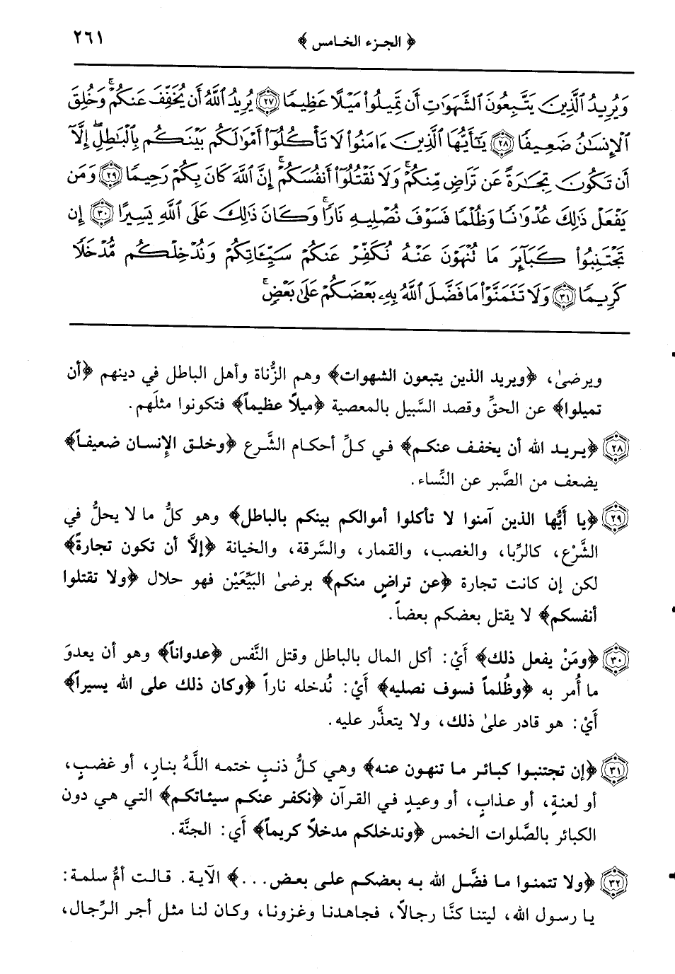 {وَلا تَتَمَنَّوْا مَا فَضَّلَ اللَّهُ بِهِ بَعْضَكُمْ على بعض} الآية قالت أمُّ سلمة: يا رسول الله ليتنا كُنَّا رجالاً فجاهدنا وغزونا وكان لنا مثل أجر الرِّجال فنزلت هذه الآية {للرجال نصيب} ثواب {مما اكتسبوا} من الجهاد {وللنساء نصيبٌ} (ثوابٌ) {ممَّا اكتسبن} من حفظ فروجهنَّ وطاعة أزواجهنَّ {واسألوا الله من فضله} إن احتجتم إلى مَا لِغَيركم فيعطيكم من فضله