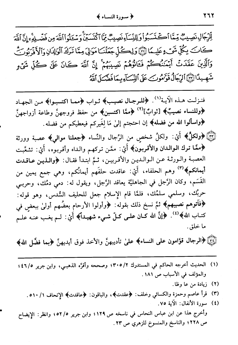 {الرجال قوَّامون على النساء} على تأديبهنَّ والأخذ فوق أيديهنَّ {بما فضَّل الله} الرِّجال على النِّساء بالعلم والعقل والقوَّة في التَّصرف والجهاد والشَّهادة والميراث {وبما أنفقوا} عليهنَّ {من أموالهم} أَي: المهر والإِنفاق عليهنَّ {فالصالحات} من النِّساء اللواتي هنَّ مطيعاتٌ لأزواجهنَّ وهو قوله: {قانتات حافظاتٌ للغيب} يحفظن فروجهنَّ فِي غيبة أزواجهنَّ {بِمَا حَفِظَ الله} بما حفظهنَّ اللَّه فِي إيجاب المهر والنَّفقة لهنَّ وإيصاء الزَّوج بهنَّ {واللاتي تخافون} تعلمون {نشوزهنَّ} عصيانهنَّ {فعظوهنَّ} بكتاب اللَّه وذكِّروهنَّ اللَّه وما أمرهنَّ به {واهجروهن في المضاجع} فرِّقوا بينكم وبينهم في المضاجع (في الفرش) {واضربوهنَّ} ضرباً غير مبرِّح شديد وللزَّوج أن يتلافى نشوز امرأنه بما أذن الله تعالى فيه يعظها بلسانه فإنْ لم تنتهِ هجر مضجعها فإنْ أبت ضربها فإن أبت أن تتَّعظ بالضرب بُعثَ الحكمان {فإن أطعنكم} فيما يُلتمس منهنَّ {فَلا تَبْغُوا عَلَيْهِنَّ سَبِيلا} لا تتجنَّوا عليهنَّ من العلل