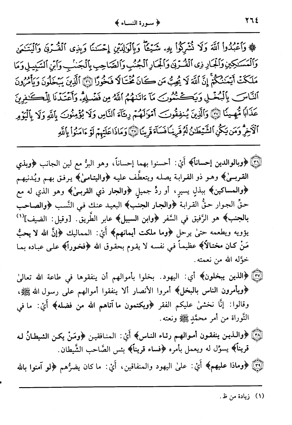 {وبالوالدين أحساناً} أَيْ: أحسنوا بهما إحساناً وهو البرُّ مع لين الجانب {وبذي القربى} وهو ذو القرابة يصله ويتعطَّف عليه {واليتامى} يرفق بهم ويُدنيهم {والمساكين} ببذلٍ يسيرٍ أو ردٍّ جميلٍ {وَالْجَارِ ذي القربى} وهو الذي له مع حقِّ الجوار حقُّ القرابة {والجار الجنب} البعيد عنك في النَّسب {والصاحب بالجنب} وهو الرَّفيق في السَّفر {وابن السبيل} عابر الطَّريق (وقيل الضيف) يؤويه ويطعمه حتى يرحل {وما ملكت أيمانهم} أَيْ: المماليك {إِنَّ اللَّهَ لا يُحِبُّ مَنْ كَانَ مُخْتَالا} عظيماً في نفسه لا يقوم بحقوق الله {فخوراً} على عباده بما خوَّله الله من نعمته