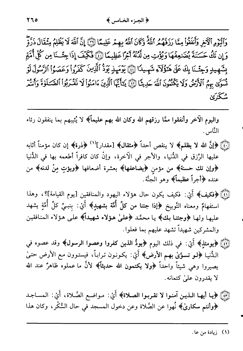 {إنَّ الله لا يظلم} لا ينقص أحداً {مثقال} مقدار {ذرة} إن كان مؤمناً أثابه عليها الرِّزق في الدُّنيا والأجر في الآخرة وإنْ كان كافراً أطعمه بها في الدُّنيا {وإن تك حسنة} من مؤمن {يضاعفها} لعشرة أضعافها {ويؤتِ مِنْ لدنه} من عنده {أجراً عظيماً} وهو الجنَّة