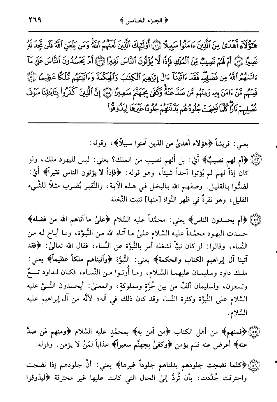 {أم يحسدون الناس} يعني: محمَّداً عليه السَّلام {على ما آتاهم الله من فضله} حسدت اليهود محمَّداً عليه السَّلام على ما آتاه من النُّبوَّة وما أباح له من النِّساء وقالوا: لو كان نبيَّاً لشغله أمر بالنُّبوَّة عن النِّساء فقال الله تعالى: {فَقَدْ آتَيْنَا آلَ إِبْرَاهِيمَ الْكِتَابَ وَالْحِكْمَةَ} يعني: النُّبوَّة {وآتيناهم ملكاً عظيماً} يعني: ملك داود وسليمان عليهما السَّلام وما أُوتوا من النِّساء فكان لداود تسعٌ وتسعون ولسليمان ألفٌ من بين حُرَّةٍ ومملوكةٍ والمعنى: أيحسدون النَّبيَّ عليه السَّلام على النُّبوَّة وكثرة النِّساء وقد كان ذلك في آله لأنَّه من آل إبراهيم عليه السَّلام