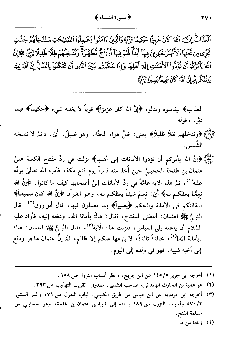 {إِنَّ اللَّهَ يَأْمُرُكُمْ أَنْ تُؤَدُّوا الأَمَانَاتِ إِلَى أهلها} نزلت في ردِّ مفتاح الكعبة على عثمان بن طلحة الحجبيِّ حين أُخذ منه قسراً يوم فتح مكة فأمره الله تعالى بردِّه عليه ثمَّ هذه الآية عامَّةٌ في ردِّ الأمانات إلى أصحابها كيف ما كانوا {إِنَّ اللَّهَ نِعِمَّا يَعِظُكُمْ بِهِ} أَيْ: نِعمَ شيئاً يعظكم به وهو القرآن {إنَّ الله كان سميعاً} لمقالتكم في الأمانة والحكم {بصيراً} بما تعملون فيها قال أبو مرزوق: قال النبي صلى الله عليه وسلم لعثمان: أعطني المفتاح فقال: هاكَ بأمانة الله ودفعه إليه فأراد عليه السَّلام أن يدفعه إلى العباس فنزلت هذه الآية فقال النبي صلى الله عليه وسلم لعثمان: هاك بأمانة الله خالدةً تالدةً لا ينزعها عنكم إلاَّ ظالم ثمَّ إنَّ عثمان هاجر ودفع إلى أخيه شيبة فهو في ولده إلى اليوم