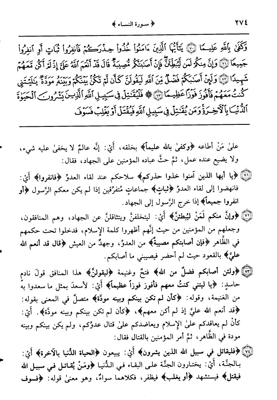 {فليقاتل في سبيل الله الذين يشرون} أَيْ: يبيعون {الحياة الدُّنيا بالآخرة} أَيْ: بالجنَّة أَيْ: يختارون الجنَّة على البقاء في الدُّنيا {ومَنْ يُقاتل في سبيل الله فيقتل} فيستشهد {أو يغلب} فيظفر فكلاهما سواءٌ وهو معنى قوله: {فسوف نؤتيه أجراً عظيماً} ثواباً لا صفة له ثمَّ حضَّ المؤمنين على الجهاد في سبيله لاستنقاذ ضعفة المؤمنين من أيدي المشركين فقال: