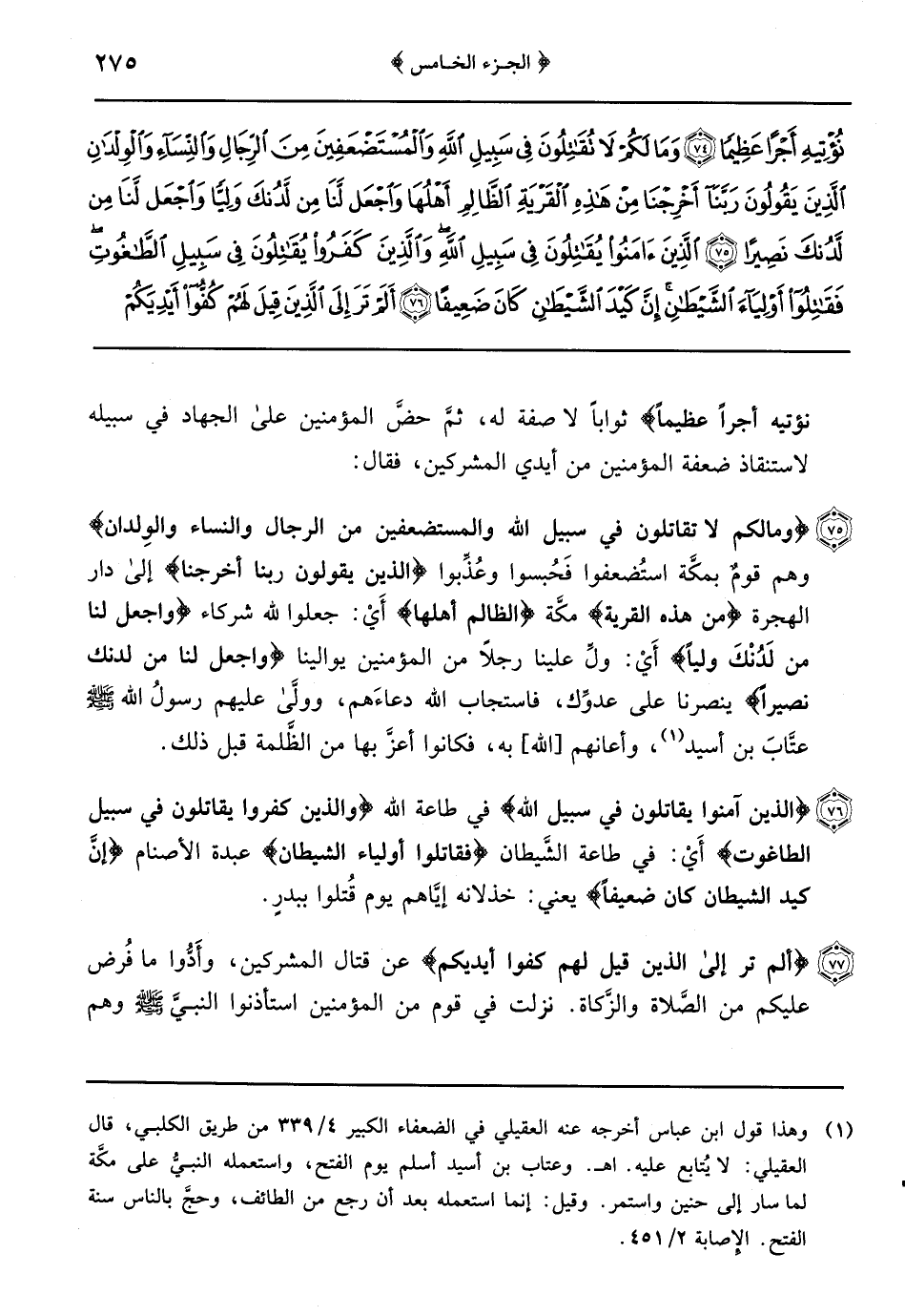 {وَمَا لَكُمْ لا تُقَاتِلُونَ فِي سَبِيلِ اللَّهِ والمستضعفين من الرجال والنساء والوِلدان} وهم قومٌ بمكَّة استُضعفوا فَحُبسوا وعُذِّبوا {الذين يقولون ربنا أخرجنا} إلى دار الهجرة {من هذه القرية} مكَّة {الظالم أهلها} أَيْ: جعلوا لله شركاء {واجعل لنا من لَدُنْكَ ولياً} أَيْ: ولِّ علينا رجلاً من المؤمنين يوالينا {وَاجْعَلْ لَنَا مِنْ لَدُنْكَ نَصِيرًا} ينصرنا على عدوِّك فاستجاب الله دعاءَهم وولَّى عليهم رسولُ الله صلى الله عليه وسلم عتَّابَ بن أسيد وأعانهم (الله) به فكانوا أعزَّ بها من الظَّلمة قبل ذلك