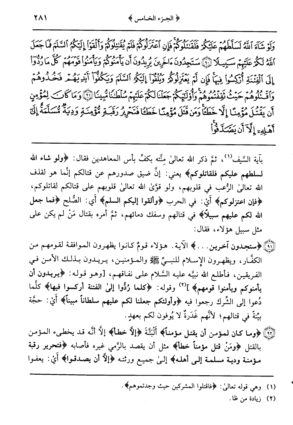 {ستجدون آخرين} الآية هؤلاء قومٌ كانوا يظهرون الموافقة لقومهم من الكفَّار ويظهرون الإسلام للنبي صلى الله عليه وسلم والمؤمنين يريدون بذلك الأمن في الفريقين فأطلع الله نبيَّه عليه السَّلام على نفاقهم وهو قوله: {يُرِيدُونَ أَنْ يَأْمَنُوكُمْ وَيَأْمَنُوا قَوْمَهُمْ} وقوله: {كُلَّ مَا رُدُّوا إِلَى الْفِتْنَةِ أُرْكِسُوا فِيهَا} كلَّما دُعوا إلى الشِّرك رجعوا فيه {وأولئكم جعلنا لكم عليهم سلطاناً مبيناً} أَيْ: حجَّة بيِّنةً في قتالهم لأنَّهم غَدَرةٌ لا يُوفون لكم بعهدٍ