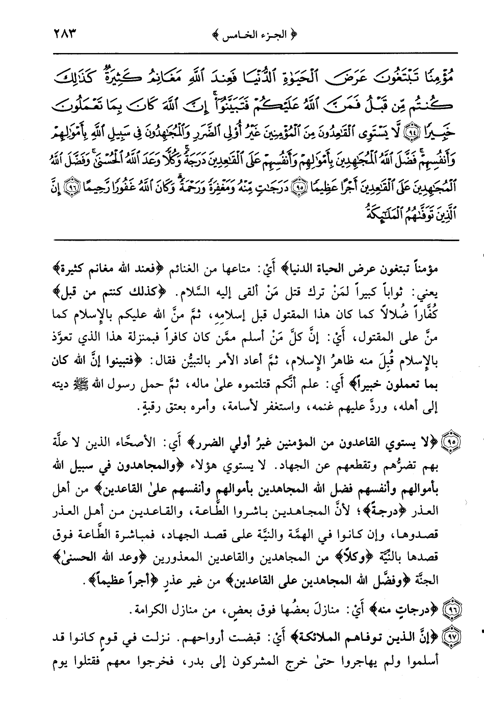 {لا يَسْتَوِي الْقَاعِدُونَ مِنَ الْمُؤْمِنِينَ غَيْرُ أُولِي الضرر} أي: الأصحَّاء الذين لا علَّة بهم تضرُّهم وتقطعهم عن الجهاد لا يستوي هؤلاء {وَالْمُجَاهِدُونَ فِي سَبِيلِ اللَّهِ بِأَمْوَالِهِمْ وَأَنْفُسِهِمْ فَضَّلَ الله المجاهدين بأموالهم وأنفسهم على القاعدين} من أهل العذر {درجةً} لأنَّ المجاهدين باشروا الطَّاعة والقاعدين من أهل العذر قصدوها وإن كانوا في الهمَّة والنيَّة على قصد الجهاد فمباشرة الطَّاعة فوق قصدها بالنِّيّة {وكلاً} من المجاهدين والقاعدين المعذورين {وعد الله الحسنى} الجنَّة {وفضَّل الله المجاهدين على القاعدين} من غير عذرٍ {أجراً عظيماً}