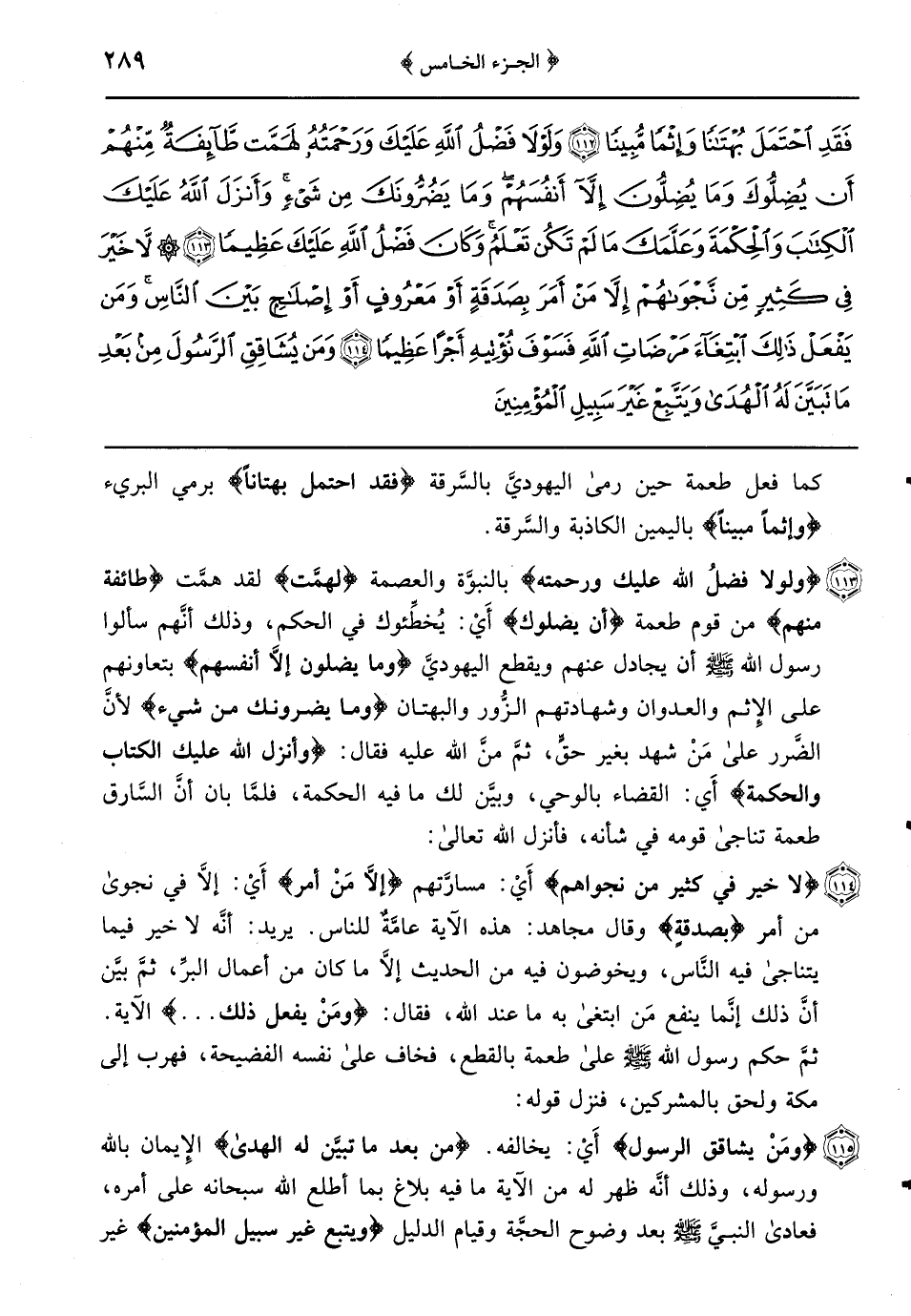 {ولولا فضلُ الله عليك ورحمته} بالنبوَّة والعصمة {لهمَّت} لقد همَّت {طائفة منهم} من قوم طعمة {أن يضلوك} أَيْ: يُخطِّئوك في الحكم وذلك أنَّهم سألوا رسول الله صلى الله عليه وسلم أن يجادل عنهم ويقطع اليهوديَّ {وما يضلون إلاَّ أنفسهم} بتعاونهم على الإِثم والعدوان وشهادتهم الزُّور والبهتان {وَمَا يَضُرُّونَكَ مِنْ شَيْءٍ} لأنَّ الضَّرر على مَنْ شهد بغير حقٍّ ثمَّ منَّ الله عليه فقال: {وَأَنْزَلَ اللَّهُ عَلَيْكَ الْكِتَابَ وَالْحِكْمَةَ} أَي: القضاء بالوحي وبيَّن لك ما فيه الحكمة فلمَّا بان أنَّ السَّارق طعمة تناجى قومه في شأنه فأنزل الله تعالى: