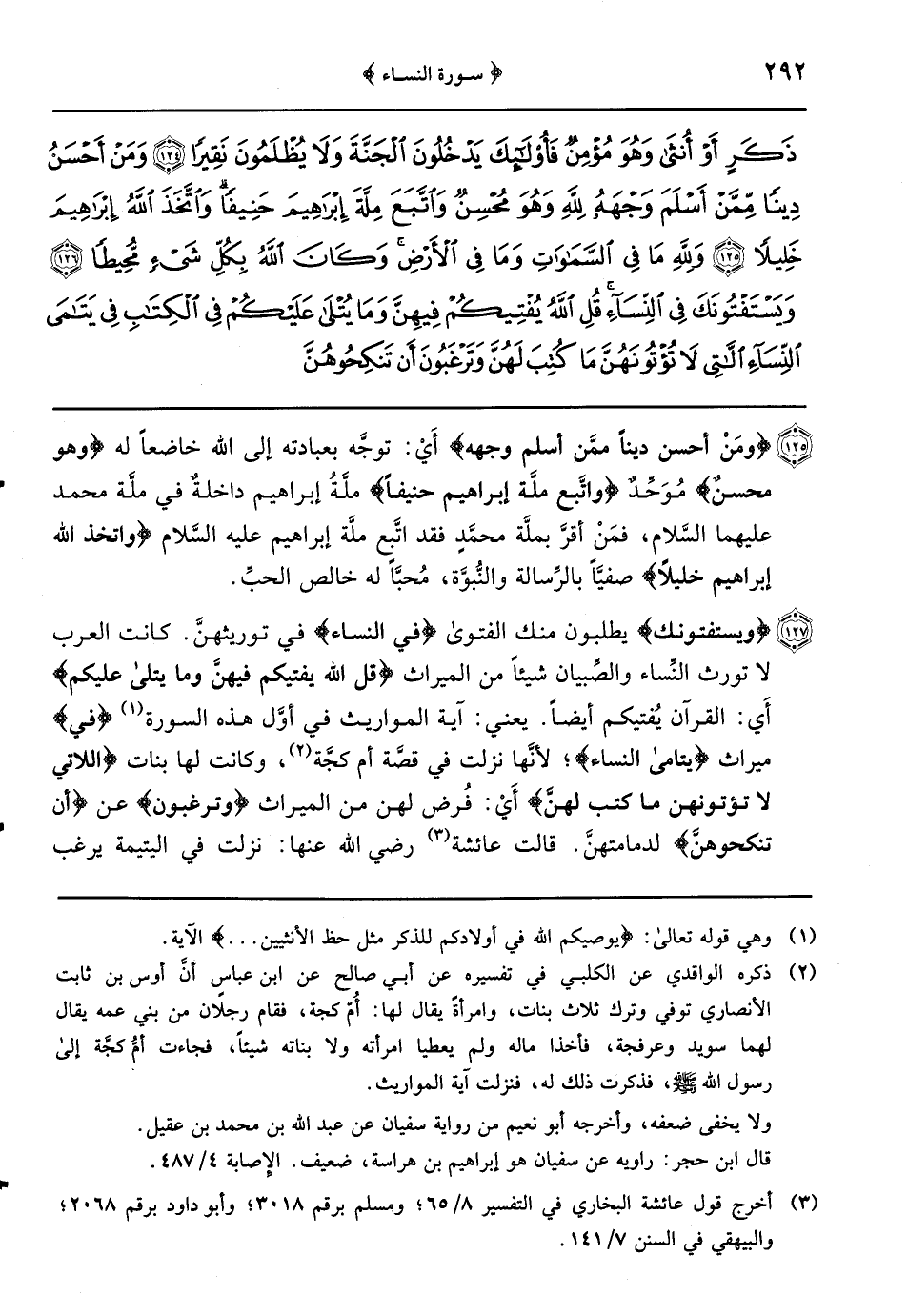 {ويستفتونك} يطلبون منك الفتوى {في النساء} في توريثهنَّ كانت العرب لا تورث النِّساء والصِّبيان شيئاً من الميراث {قُلِ اللَّهُ يُفْتِيكُمْ فِيهِنَّ وَمَا يُتْلَى عَلَيْكُمْ} أَي: القرآن يُفتيكم أيضاً يعني: آية المواريث في أوَّل هذه السورة {في} ميراث {يتامى النساء} لأنَّها في قصَّة أم كجَّة وكانت لها بنات {اللاتي لا تؤتونهن ما كتب لهنَّ} أَيْ: فُرض لهن من الميراث {وترغبون} عن {أن تنكحوهنَّ} لدمامتهنَّ قالت عائشة رضي الله عنها: نزلت في اليتيمة يرغب وليها عن نكاحها ولا ينكحها فيعضلها طعما في ميراثها فنُهي عن ذلك {والمستضعفين من الولدان} أَيْ: يُفتيكم في الصِّغار من الغلمان والجواري أن تعطوهنَّ حقهنَّ {وأن تقوموا} أَيْ: وفي أن تقوموا {لليتامى بالقسط} أَي: بالعدل في مهورهنَّ ومواريثهنَّ {وما تفعلوا من خير} من حسنٍ فيما أمرتكم به {فَإِنَّ اللَّهَ كان به عليماً} يجازيكم عليه
