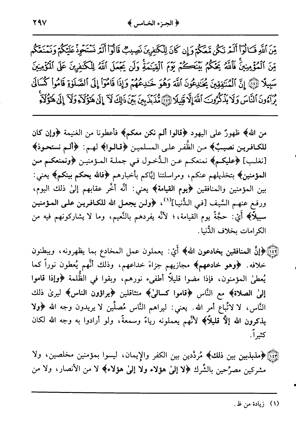 {مذبذبين بين ذلك} مُردَّدين بين الكفر والإِيمان ليسوا بمؤمنين مخلصين ولا مشركين مصرِّحين بالشِّرك {لا إلى هؤلاء ولا إلى هؤلاء} لا من الأنصار ولا من اليهود {وَمَنْ يُضْلِلِ اللَّهُ فَلَنْ تَجِدَ لَهُ سَبِيلا} من أضلَّه الله فلن تجد له ديناً