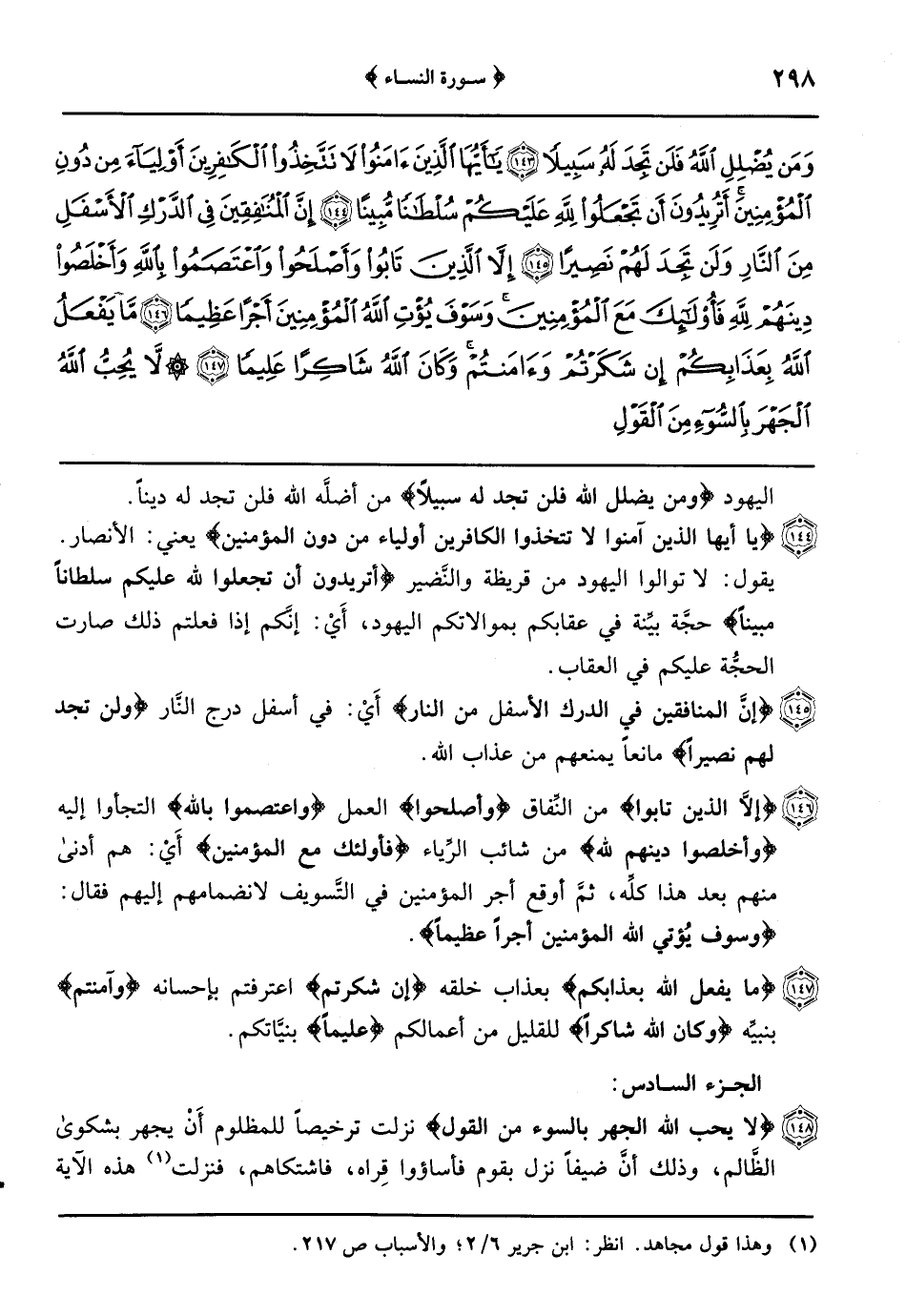 {لا يُحِبُّ اللَّهُ الْجَهْرَ بِالسُّوءِ مِنَ الْقَوْلِ} نزلت ترخيصاً للمظلوم أنْ يجهر بشكوى الظَّالم وذلك أنَّ ضيفاً نزل بقوم فأساؤوا قِراه فاشتكاهم فنزلت هذه الآية رخصةً في أن يشكوا وقوله: {إلاَّ من ظلم} لكن من ظلم فإنَّه يجهر بالسُّوء من القول وله ذلك {وكان الله سميعاً} لقول المظلوم {عليماً} بما يضمره أَيْ: فليقل الحقِّ ولا يتعدَّ ما اُذن له فيه