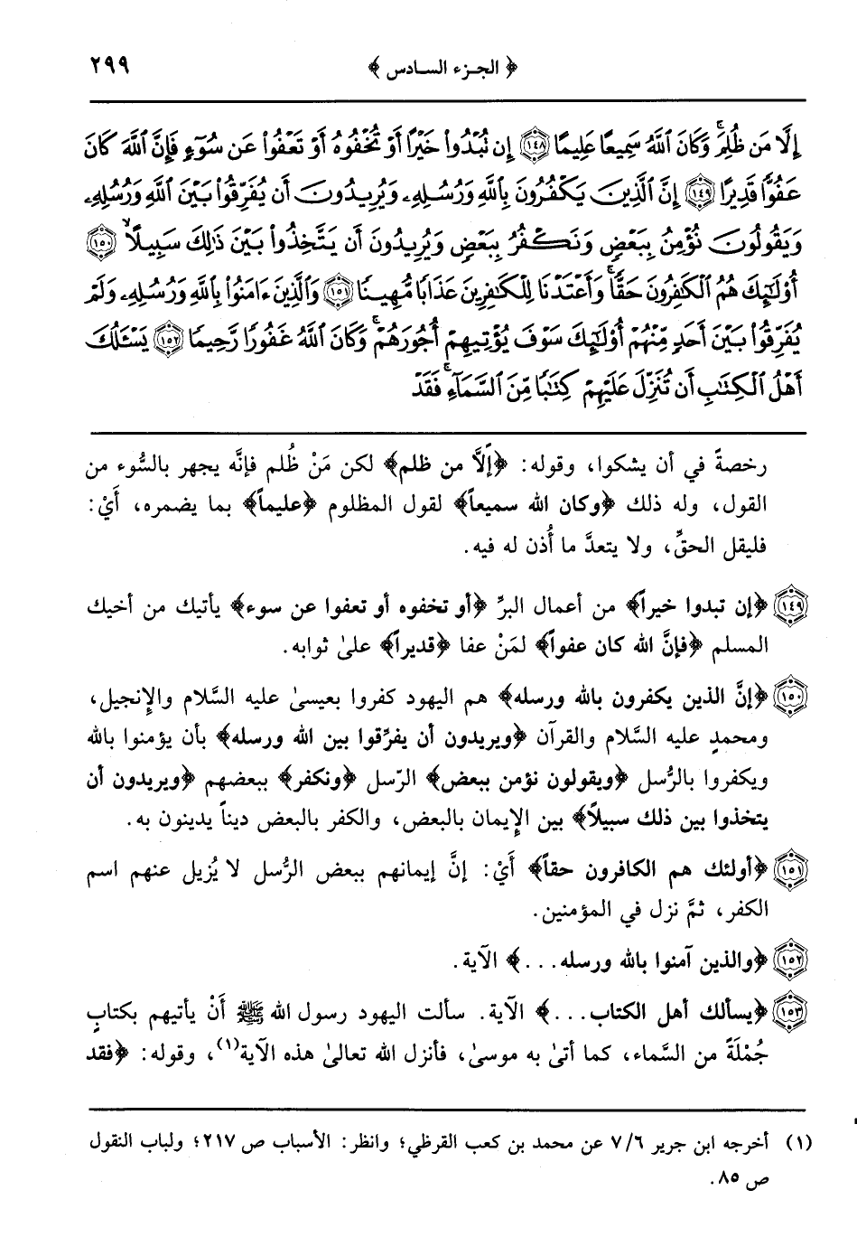 {إنَّ الذين يكفرون بالله ورسله} هم اليهود كفروا بعيسى عليه السَّلام والإِنجيل ومحمدٍ عليه السَّلام والقرآن {وَيُرِيدُونَ أَنْ يُفَرِّقُوا بَيْنَ اللَّهِ وَرُسُلِهِ} بأن يؤمنوا بالله ويكفروا بالرُّسل {ويقولون نؤمن ببعض} الرّسل {ونكفر} ببعضهم {وَيُرِيدُونَ أَنْ يَتَّخِذُوا بَيْنَ ذَلِكَ سَبِيلا} بيْن الإِيمان بالبعض والكفر بالبعض ديناً يدينون به