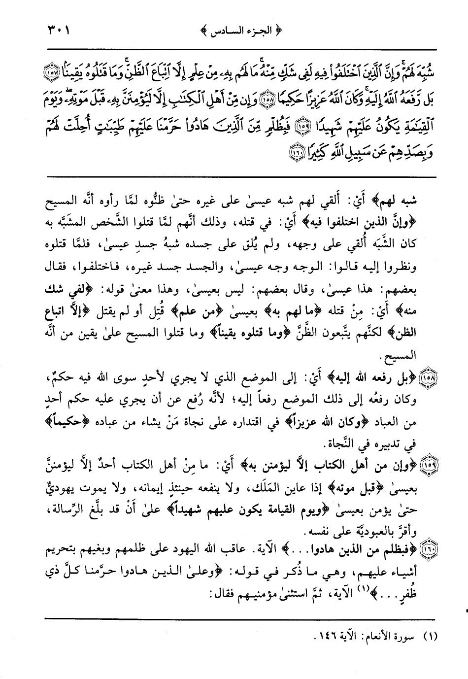 {وَإِنْ مِنْ أَهْلِ الْكِتَابِ إِلا لَيُؤْمِنَنَّ بِهِ} أَيْ: ما مِن أهل الكتاب أحدٌ إلاَّ ليؤمننَّ بعيسى {قبل موته} إذا عاين المَلَك ولا ينفعه حينئذٍ إيمانه ولا يموت يهوديٌّ حتى يؤمن بعيسى {وَيَوْمَ الْقِيَامَةِ يَكُونُ عَلَيْهِمْ شَهِيدًا} على أنْ قد بلَّغ الرِّسالة وأقرَّ بالعبوديَّة على نفسه