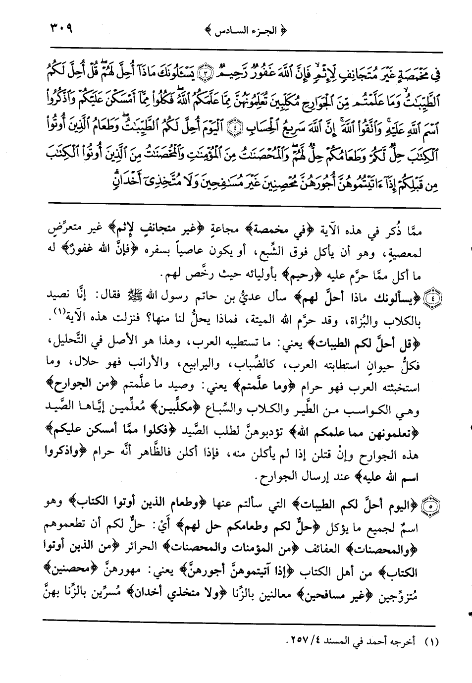 {اليوم أحلَّ لكم الطيبات} التي سألتم عنها {وطعام الذين أوتوا الكتاب} وهو اسمٌ لجميع ما يؤكل {حلٌّ لكم وطعامكم حل لهم} أَيْ: حلٌّ لكم أن تطعموهم {والمحصنات} العفائف {من المؤمنات والمحصنات} الحرائر {من الذين أوتوا الكتاب} من أهل الكتاب {إذا آتيتموهنَّ أجورهنَّ} يعني: مهورهنَّ {محصنين} مُتزوِّجين {غير مسافحين} معالنين بالزِّنا {ولا متخذي أخدان} مُسرّين بالزِّنا بهنَّ {ومَنْ يكفر بالإِيمان} بالله الذي يجب الإِيمان به {فقد حبط عمله} إذا مات على ذلك {وهو في الآخرة من الخاسرين} ممَّنْ خسر الثَّواب