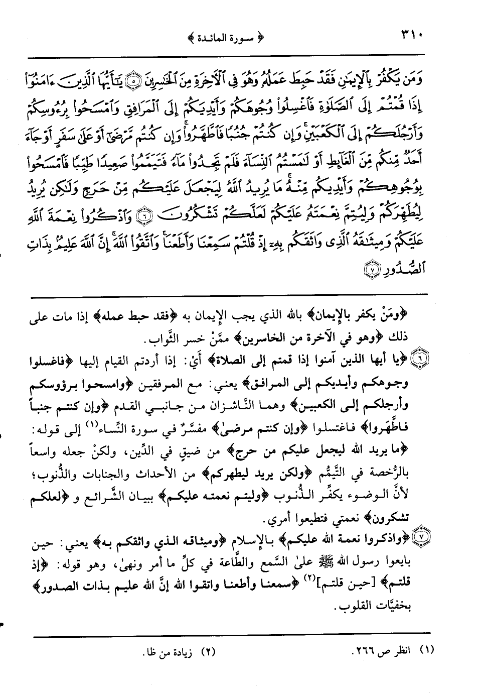 {يا أيها الذين آمنوا إذا قمتم إلى الصلاة} أَيْ: إذا أردتم القيام إليها {فاغسلوا وجوهكم وأيديكم إلى المرافق} يعني: مع المرفقين {وامسحوا برؤوسكم وأرجلكم إلى الكعبين} وهما النَّاشزان من جانبي القدم {وإن كنتم جنباً فاطَّهَروا} فاغتسلوا {وإن كنتم مرضى} مفسَّرٌ في سورة النساء إلى قوله: {مَا يُرِيدُ الله ليجعل عليكم من حرج} من ضيقٍ في الدِّين ولكنْ جعله واسعاً بالرُّخصة في التَّيمُّم {ولكن يريد ليطهركم} من الأحداث والجنابات والذُّنوب لأنَّ الوضوء يكفِّر الذُّنوب {وليتم نعمته عليكم} ببيان الشَّرائع و {لعلكم تشكرون} نعمتي فتطيعوا أمري