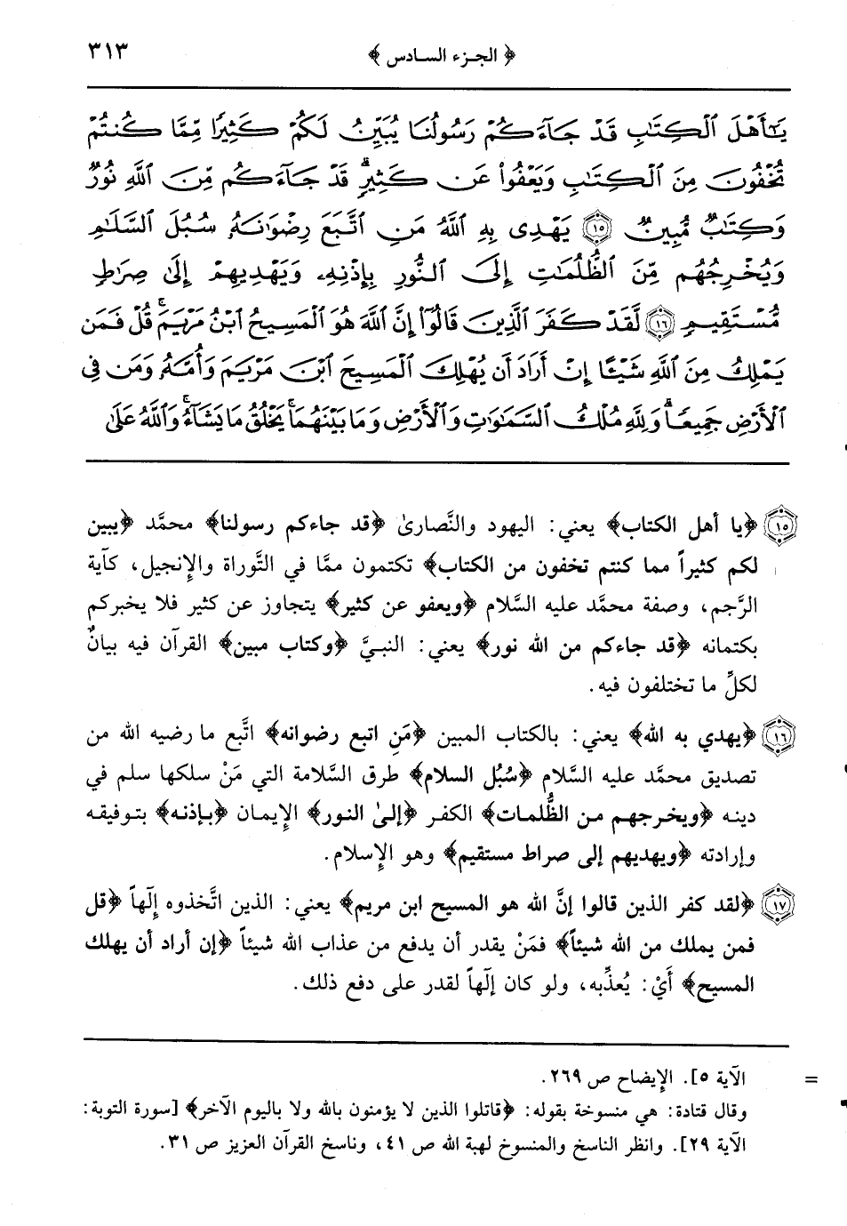 {يا أهل الكتاب} يعني: اليهود والنَّصارى {قد جاءكم رسولنا} محمَّد {يُبَيِّنُ لَكُمْ كَثِيرًا مِمَّا كُنْتُمْ تُخْفُونَ مِنَ الكتاب} تكتمون ممَّا في التَّوراة والإِنجيل كآية الرَّجم وصفة محمَّد عليه السَّلام {ويعفو عن كثير} يتجاوز عن كثير فلا يخبركم بكتمانه {قد جاءكم من الله نور} يعني: النبيَّ {وكتاب مبين} القرآن فيه بيانٌ لكلِّ ما تختلفون فيه