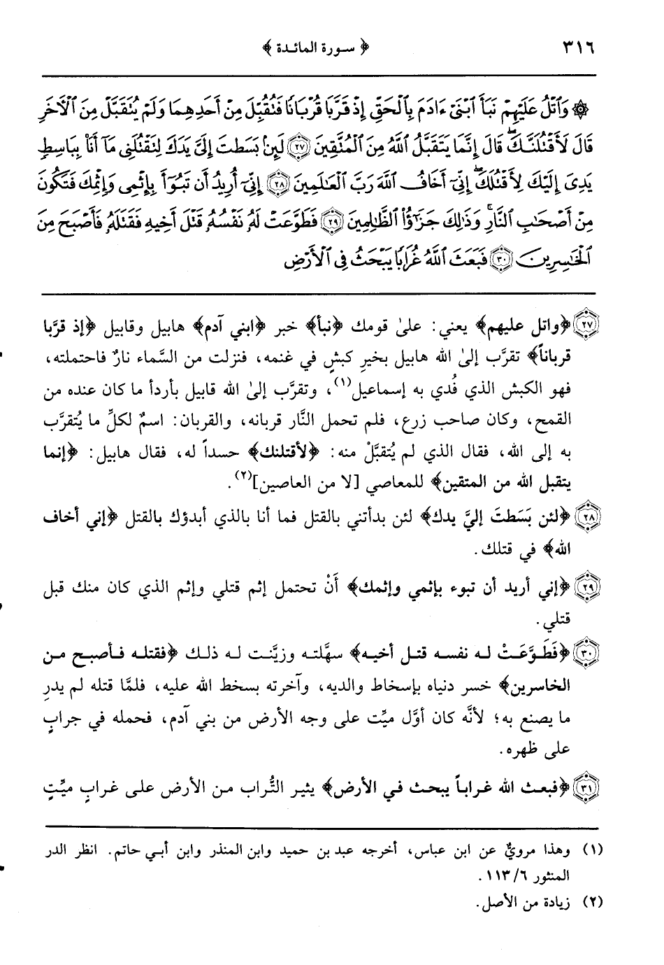 {واتل عليهم} يعني: على قومك {نبأ} خبر {ابني آدم} هابيل وقابيل {إذ قرَّبا قرباناً} تقرَّب إلى الله هابيل بخيرِ كبشٍ في غنمه فنزلت من السَّماء نارٌ فاحتملته فهو الكبش الذي فُدي به إسماعيل وتقرَّب إلى الله قابيل بأردأ ما كان عنده من القمح وكان صاحب زرع فلم تحمل النَّار قربانه والقربان: اسمٌ لكلِّ ما يُتقرَّب به إلى الله فقال الذي لم يُتقبَّلْْ منه: {لأقتلنك} حسداً له فقال هابيل: {إنما يتقبل الله من المتقين} للمعاصي (لا من العاصين)