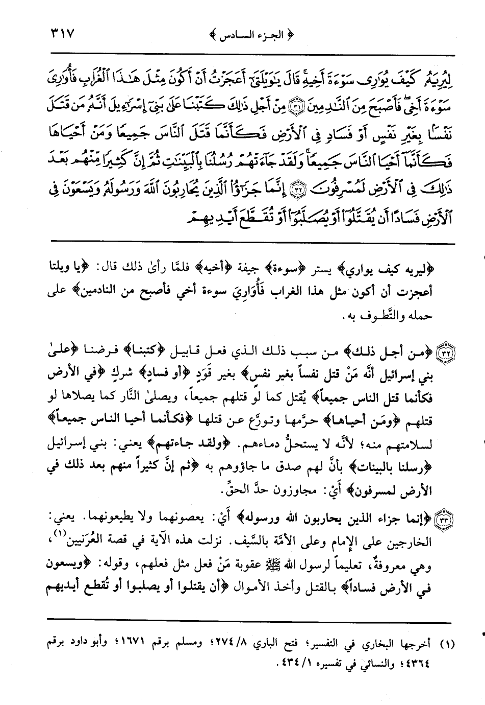 {من أجل ذلك} من سبب ذلك الذي فعل قابيل {كتبنا} فرضنا {على بني إسرائيل أَنَّهُ مَنْ قَتَلَ نفساً بغير نفسٍ} بغير قَوَدٍ {أو فسادٍ} شركٍ {في الأرض فكأنما قتل الناس جميعاً} يُقتل كما لو قتلهم جميعاً ويصلى النَّار كما يصلاها لو قتلهم {ومَن أحياها} حرَّمها وتورَّع عن قتلها {فَكَأَنَّمَا أَحْيَا النَّاسَ جَمِيعًا} لسلامتهم منه لأنَّه لا يستحلُّ دماءهم {ولقد جاءتهم} يعني: بني إسرائيل {رسلنا بالبينات} بأنَّ لهم صدق ما جاؤوهم به {ثُمَّ إِنَّ كَثِيرًا مِنْهُمْ بَعْدَ ذَلِكَ فِي الأرض لمسرفون} أَيْ: مجاوزون حدَّ الحقِّ