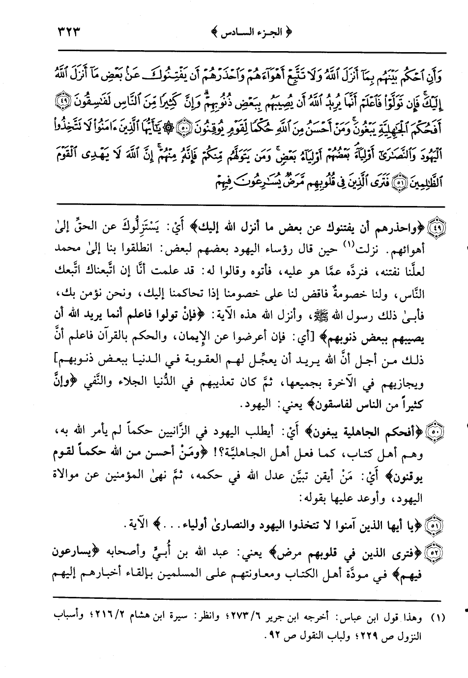{وَاحْذَرْهُمْ أَنْ يَفْتِنُوكَ عَنْ بَعْضِ مَا أَنْزَلَ الله إليك} أَيْ: يَسْتَزِلُّوكَ عن الحقِّ إلى أهوائهم نزلت حين قال رؤساء اليهود بعضهم لبعض: انطلقوا بنا إلى محمد لعلَّنا نفتنه فنرده عمَّا هو عليه فأتوه وقالوا له: قد علمت أنَّا إن اتَّبعناك اتَّبعك النَّاس ولنا خصومةٌ فاقض لنا على خصومنا إذا تحاكمنا إليك ونحن نؤمن بك فأبى ذلك رسول الله صلى الله عليه وسلم وأنزل الله هذه الآية: {فَإِنْ تَوَلَّوْا فَاعْلَمْ أَنَّمَا يُرِيدُ اللَّهُ أَنْ يصيبهم ببعض ذنوبهم} (أي: فإن أعرضوا عن الإِيمان والحكم بالقرآن فاعلم أنَّ ذلك من أجل أنَّ الله يريد أن يعجِّل لهم العقوبة في الدنيا ببعض ذنوبهم) ويجازيهم في الآخرة بجميعها ثمَّ كان تعذيبهم في الدُّنيا الجلاء والنَّفي {وَإِنَّ كَثِيرًا مِنَ النَّاسِ لَفَاسِقُونَ} يعني: اليهود