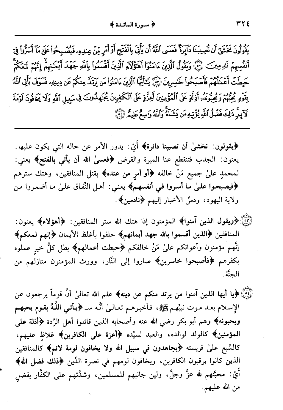 {يا أيها الَّذِينَ آمَنُوا مَنْ يَرْتَدَّ مِنْكُمْ عَنْ دِينِهِ} علم الله تعالى أنَّ قوماً يرجعون عن الإِسلام بعد موت نبيِّهم صلى الله عليه وسلم فأخبرهم تعالى أنَّه س {يأتي اللَّهُ بقوم يحبهم ويحبونه} وهم أبو بكر رضي الله عنه وأصحابه الذين قاتلوا أهل الرِّدة {أذلة على المؤمنين} كالولد لوالده والعبد لسيِّده {أعزة على الكافرين} غلاظٍ عليهم كالسَّبع على فريسته {يُجَاهِدُونَ فِي سَبِيلِ اللَّهِ وَلا يَخَافُونَ لَوْمَةَ لائم} كالمنافقين الذين كانوا يرقبون الكافرين ويخافون لومهم في نصرة الدِّين {ذلك فضل الله} أَيْ: محبَّتهم لله عز وجل ولين جانبهم للمسلمين وشدَّتهم على الكفَّار بفضلٍ من الله عليهم