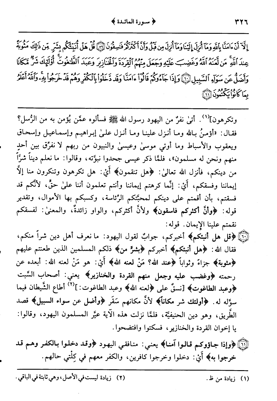 {قل هل أنبئكم} أخبركم جوابٌ لقول اليهود: ما نعرف أهل دين شراً منكم فقال الله: {هل أنبئكم} أخبركم {بشرٍّ من} ذلكم المسلمون الذين طعنتم عليهم {مثوبة} جزاءً وثواباً {عند الله مَنْ لَعَنَهُ اللَّهُ} أَيْ: هو مَنْ لعنه الله: أبعده عن رحمته {وغضب عليه وجعل منهم القردة والخنازير} يعني: أصحاب السَّبت {وعبد الطاغوت} نسقٌ على {لعنه الله} وعبد الطاغوت أطاع الشَّيطان فيما سوَّله له {أولئك شر مكاناً} لأنَّ مكانهم سَقَر {وأضل عن سواء السبيل} قصد الطَّريق وهو دين الحنيفيَّة فلمَّا نزلت هذه الآية عيَّر المسلمون اليهود وقالوا: يا إخوان القردة والخنازير فسكتوا وافتضحوا