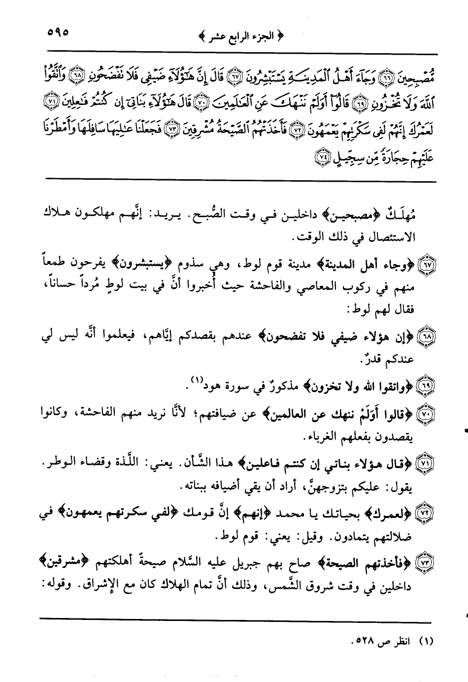 {وجاء أهل المدينة} مدينة قوم لوط وهي سذوم {يستبشرون} يفرحون طمعاً منهم في ركوب المعاصي والفاحشة حيث أُخبروا أنَّ في بيت لوطٍ مُرداً حساناً فقال لهم لوط: