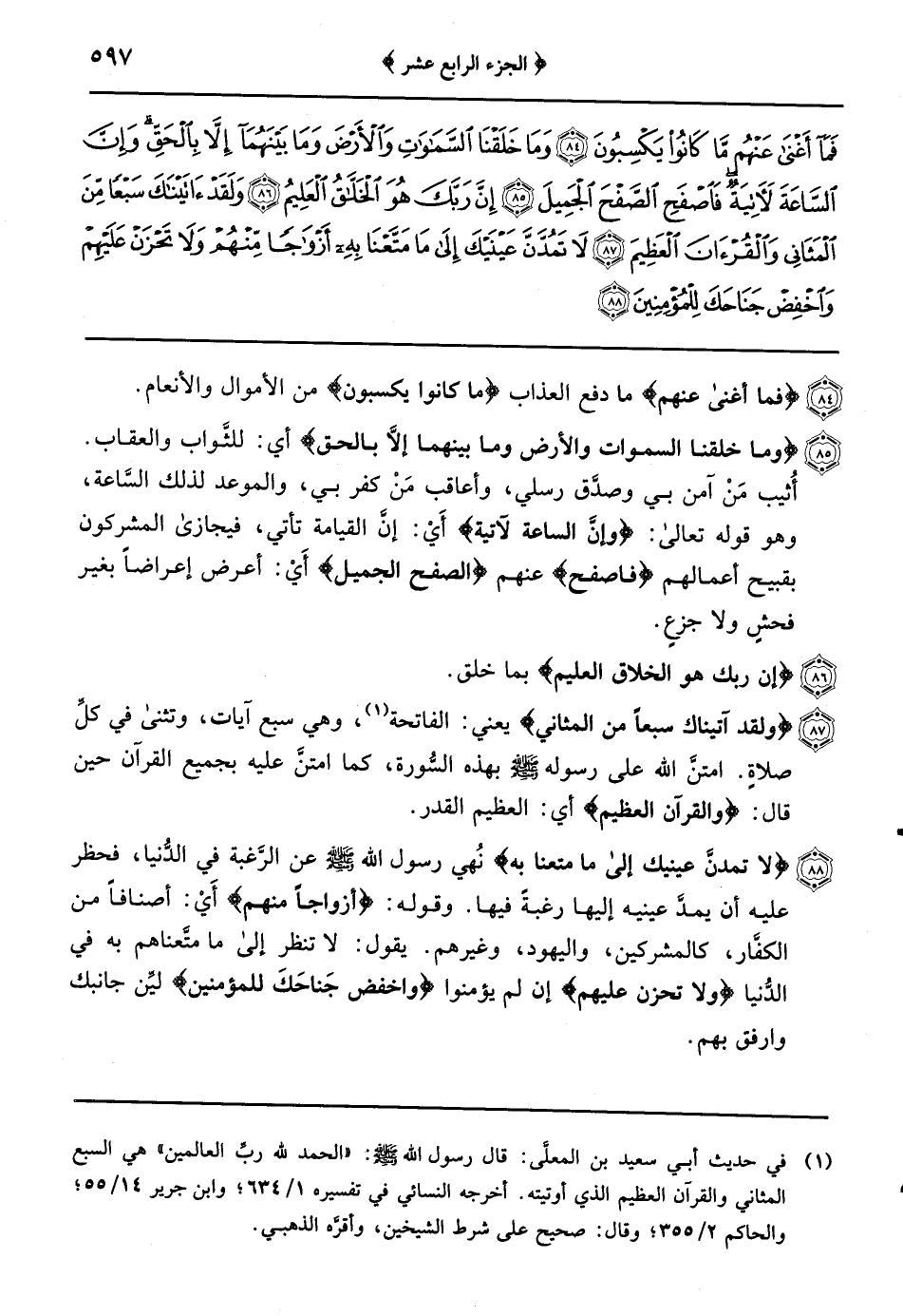 {ولقد آتيناك سبعاً من المثاني} يعني: الفاتحة وهي سبع آيات وتثنى في كلِّ صلاةٍ امتنَّ الله على رسوله صلى الله عليه وسلم بهذه السُّورة كما امتنَّ عليه بجميع القرآن حين قال: {والقرآن العظيم} أي: العظيم القدر