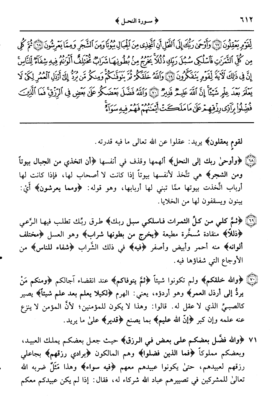 {ثُمَّ كُلِي مِنْ كُلِّ الثَّمَرَاتِ فَاسْلُكِي سُبُلَ ربك} طرق ربِّك تطلب فيها الرَّعي {ذللاً} منقادة مُسخَّرة مطيعة {يخرج من بطونها شراب} وهو العسل {مختلف ألوانه} منه أحمر وأبيض وأصفر {فيه} في ذلك الشَّراب {شفاء للناس} من الأوجاع التي شفاؤها فيه