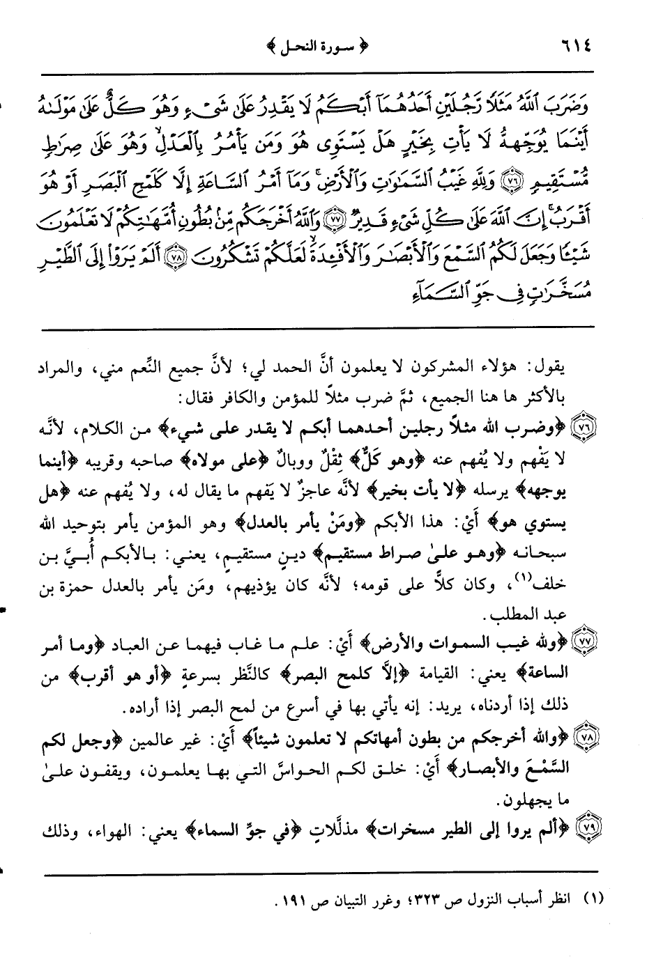 {وَضَرَبَ اللَّهُ مَثَلا رَجُلَيْنِ أَحَدُهُمَا أَبْكَمُ لا يَقْدِرُ عَلَى شَيْءٍ} من الكلام لأنَّه لا يَفْهم ولا يُفهم عنه {وهو كَلٌّ} ثِقْلٌ ووبالٌ {على مولاه} صاحبه وقريبه {أينما يوجهه} يرسله {لا يَأْتِ بِخَيْرٍ} لأنَّه عاجزٌ لا يَفهم ما يقال له ولا يُفهم عنه {هَلْ يستوي هو} أَيْ: هذا الأبكم {ومَنْ يأمر بالعدل} وهو المؤمن يأمر بتوجيد الله سبحانه {وهو على صراط مستقيم} دينٍ مستقيمٍ يعني: بالأبكم أُبيَّ بن خلف وكان كلاًّ على قومه لأنَّه كان يؤذيهم ومَن يأمر بالعدل حمزة بن عبد المطلب