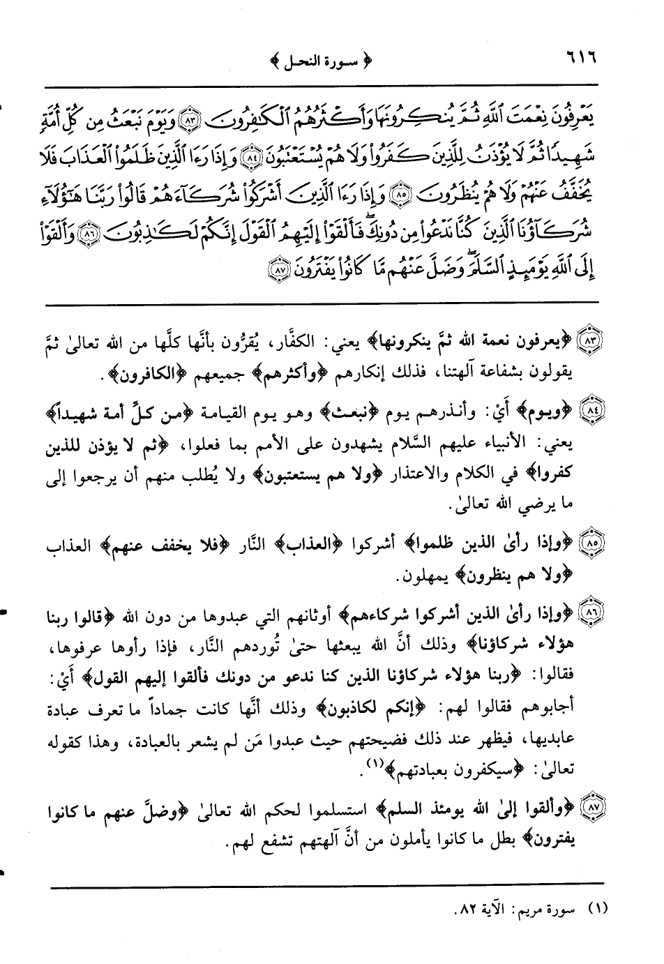 {ويوم} أَيْ: وأنذرهم يوم {نبعث} وهو يوم القيامة {من كلِّ أمة شهيداً} يعني: الأنبياء عليهم السَّلام يشهدون على الأمم بما فعلوا {ثم لا يؤذن للذين كفروا} في الكلام والاعتذار {ولا هم يستعتبون} ولا يُطلب منهم أن يرجعوا إلى ما يرضي الله تعالى