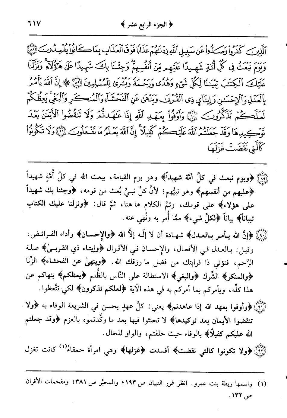 {ولا تكونوا كالتي نقضت} أفسدت {غزلها} وهي امرأة حمقاء كانت تغزل طول يومها ثمَّ تنقضه وتفسده {من بعد قوة} الغزل بإمراره وفتله {أنكاثاً} قطعاً وتم الكلام هاهنا ثمَّ قال: {تتخذون أيمانكم دخلاً بينكم} أَيْ: غشَّاً وخديعةً {أن تكون} بأن تكون أو لأن تَكُونَ {أُمَّةٌ هِيَ أَرْبَى مِنْ أُمَّةٍ} أَيْ: قوم أغنى وأعلى من قوم وذلك أنهم كانوا يحالفون قوماً فيجدون أكثر منهم وأعزَّّ فينقضون حلف أولئك ويحالفون هؤلاء الذين هم أعزُّ فنُهوا عن ذلك {إنما يبلوكم الله به} أَيْ: بما أمر ونهى {وَلَيُبَيِّنَنَّ لَكُمْ يَوْمَ الْقِيَامَةِ مَا كُنْتُمْ فِيهِ تختلفون} في الدنيا عن أيمان الخديعة فقال: