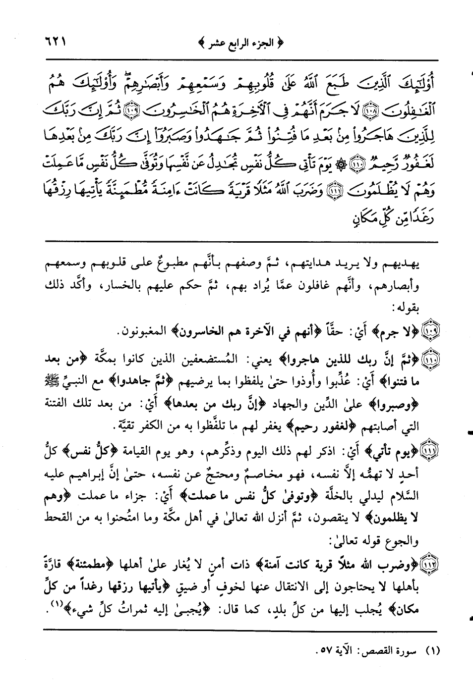 {وضرب الله مثلاً قرية كانت آمنة} ذات أمنٍ لا يُغار على أهلها {مطمئنة} قارَّةً بأهلها لا يحتاجون إلى الانتقال عنها لخوفٍ أو ضيقٍ {يأتيها رزقها رغداً من كلِّ مكان} يُجلب إليها من كلِّ بلدٍ كما قال: {يُجبى إليه ثمراتُ كلِّ شيء} {فكفرت بأنعم الله} حين كذَّبوا رسوله {فأذاقها الله لباس الجوع} عذَّبهم الله بالجوع سبع سنين {والخوف} من سرايا النَّبيِّ صلى الله عليه وسلم التي كان يبعثهم إليهم فيطوفون بهم {بما كانوا يصنعون} من تكذيب النبيِّ صلى الله عليه وسلم وإخراجه من مكَّة