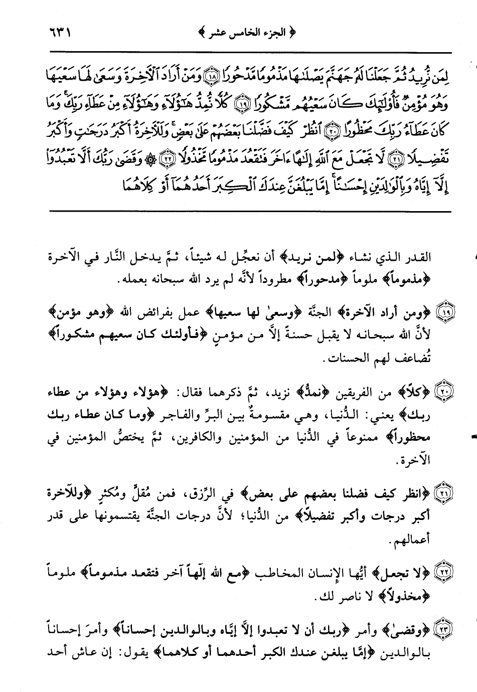 {ولا تجعل يدك مغلولة إلى عنقك} لا تُمسكها عن البذل كلَّ الإِمساك حتى كأنَّها مقبوضة إلى عنقك لا تنبسط بخيرٍ {ولا تبسطها كلَّ البسط} في النفقة والعطيَّة {فتقعد ملوماً} تلوم نفسك وتُلام {محسوراً} ليس عندك شيء من قولهم: حسرتُ الرَّجل بالمسألة: إذا أفنيتَ جميع ما عنده نزلت هذه الآية حين وهب رسول الله صلى الله عليه وسلم قميصه ولم يجد ما يلبسه للخروج فبقي في البيت