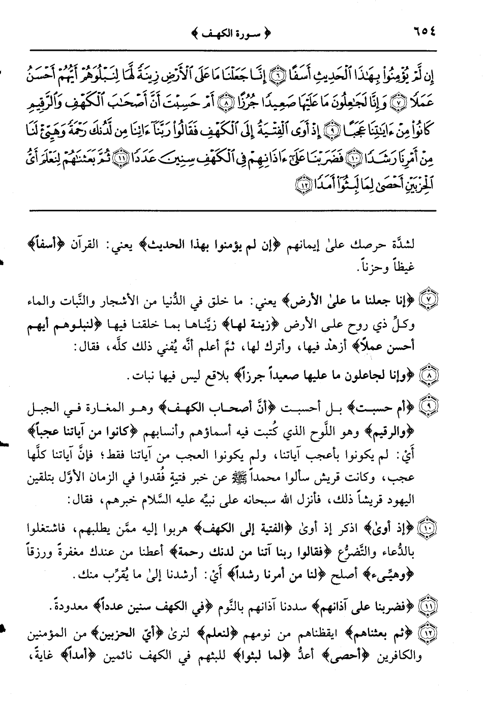 {وتحسبهم أيقاظاً} لأنَّ أعينهم مُفتَّحة {وهم رقود} نيامٌ {ونقلبهم ذات اليمين وذات الشمال} لئلا تأكل الأرض لحومهم {وكلبهم باسط ذراعيه} يديه {بالوصيد} بفناء الكهف {لو اطلعت} أشرفت {عليهم لوليت} أعرضت {منهم فراراً ولملئت منهم رعباً} خوفاً وذلك أن الله تعالى منعهم بالرُّعب لئلا يراهم أحد